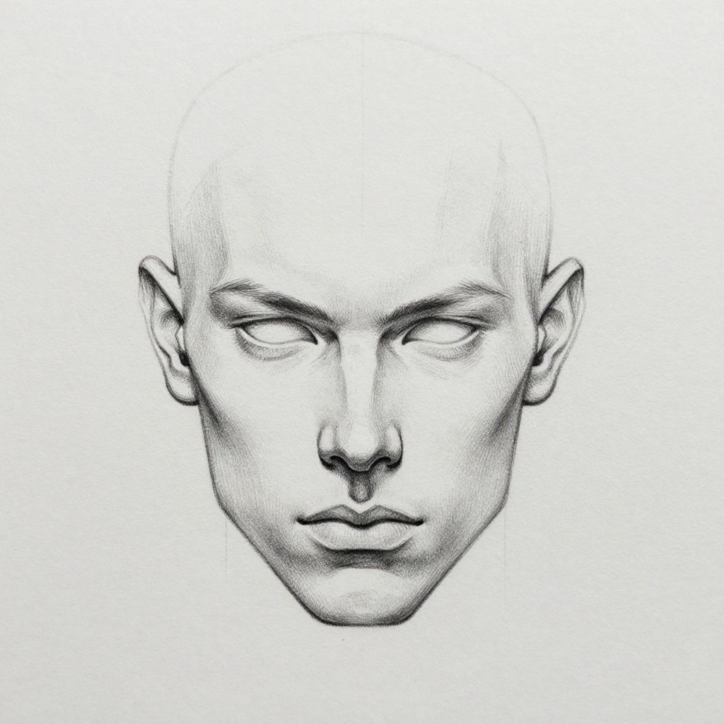 Black and white digital drawing of a bald, expressionless human face with hollow eyes, detailed shading, and a minimalist background.