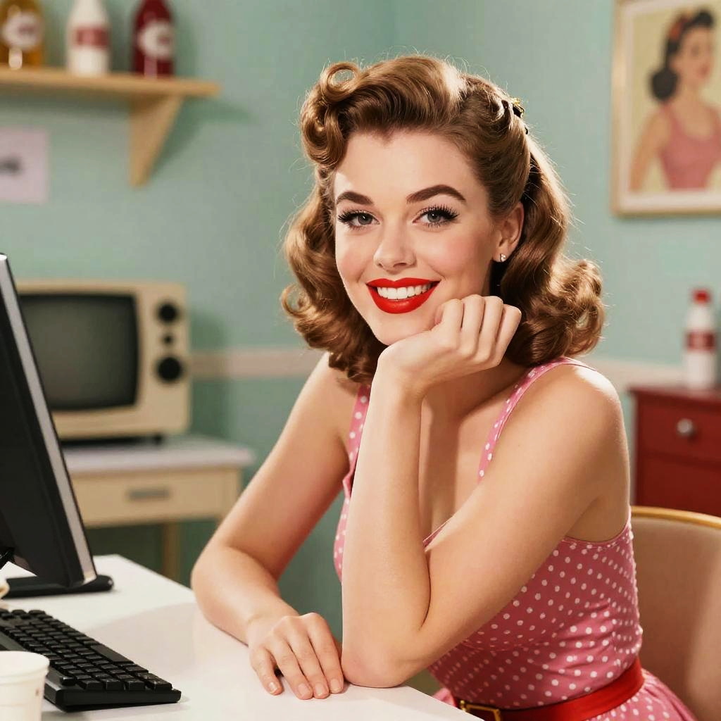 Pin up maker lab, vintage 1950s style glamorous pin up girl illustration, bright retro colors, classic pose with curled hair and red lipstick, soft lighting with a playful smile, high detail, artistic pin up poster vibe