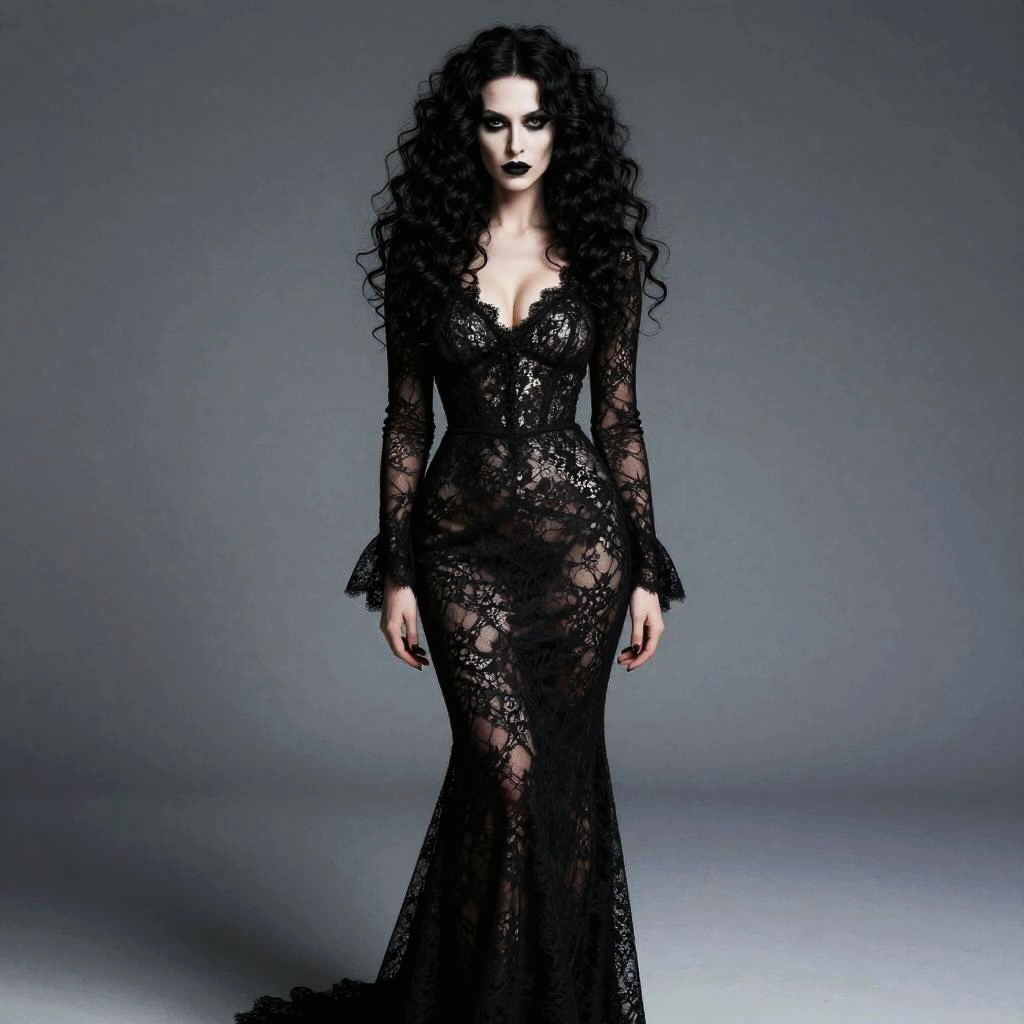 Photograph of a pale-skinned woman with long, curly black hair and dark, dramatic makeup standing against a gray background. She's wearing a form-fitting, black lace gown with long, sheer sleeves that flare out slightly, and a plunging neckline. Her expression is intense and mysterious, and her hands are relaxed by her sides. The gown has a slight train, adding to the gothic elegance of the look.