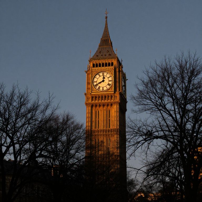 Amidst the twilight's embrace, a towering clock looms like a sentinel of time, its golden glow casting a warm yet enigmatic light upon the barren trees, evoking a sense of timeless mystery and introspective solitude.