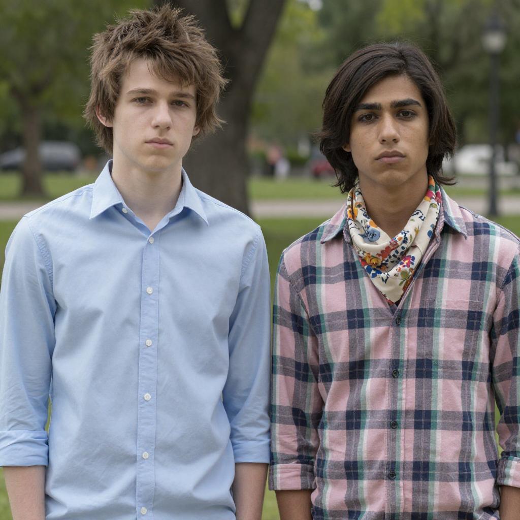 Photograph of two young men standing outdoors in a park. The man on the left has shaggy brown hair, light blue shirt, and neutral expression. The man on the right has shoulder-length dark brown hair, pink and green plaid shirt, floral scarf, and serious expression. Background includes trees and blurred park scenery.