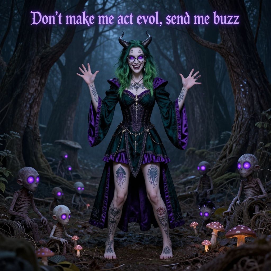 A nerdy, glasses-wearing, horned, shoulder-length green-haired, glowing purple-eyed, evil druid woman, covered in Gothic tattoos, barefoot, wearing short dark-emerald robes trimmed with purple silk and Gothic jewelry, full body generation, standing in a dead forest at night, making a playful and sinister smile, purple-eyed homunculi playing around her bare feet, glowing mushrooms all around her, a theme of beautiful decay and rot, Digital art, Purple glowing text above her head \"Don't make me act evil, send me buzz\