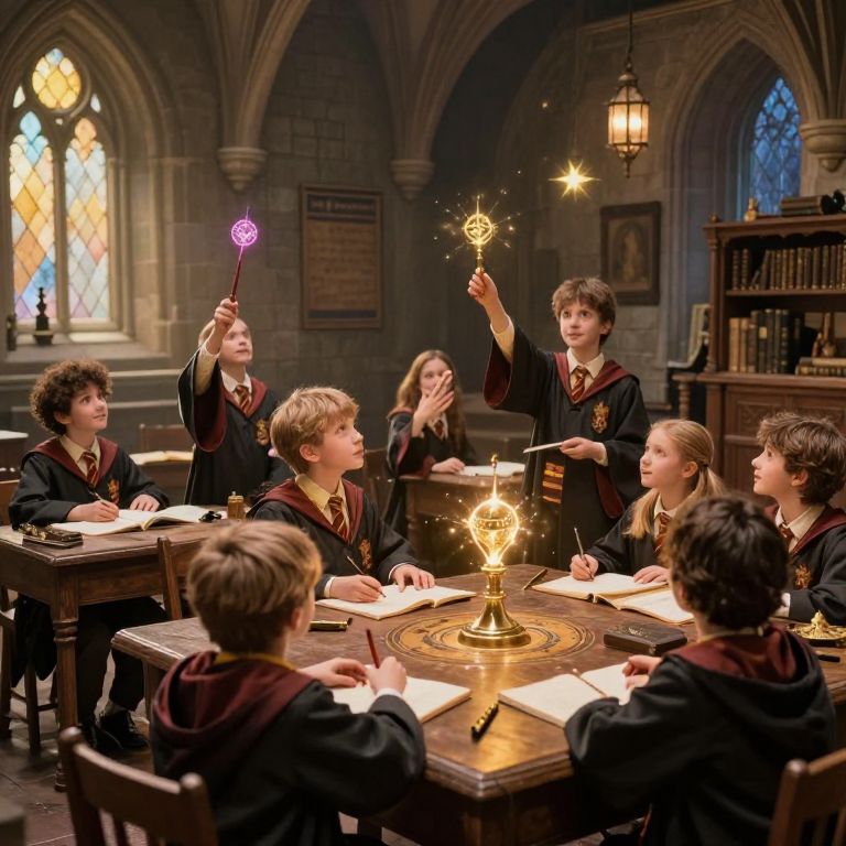 Dynamics young pupils in the school of magic, learning to cast a spell. the classroom is in an old castle. illustration, realistic, magical,