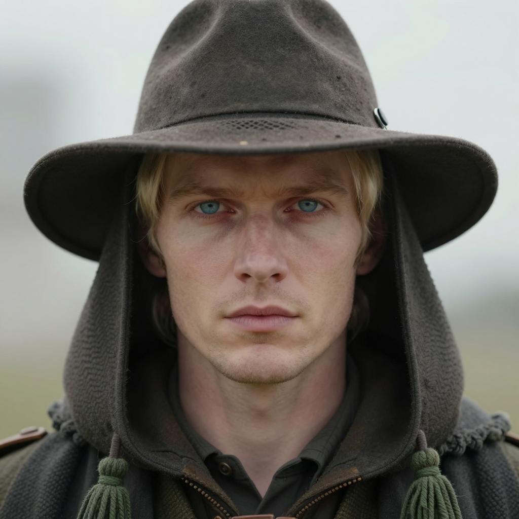 Close-up portrait of a rugged Caucasian man with long brown hair and a dark mustache, wearing a weathered wide-brimmed hat and a black hooded jacket with snowflakes on the fabric and his face. The man has intense blue eyes and a serious expression, standing outdoors in a snowy environment with a blurred blue sky background.