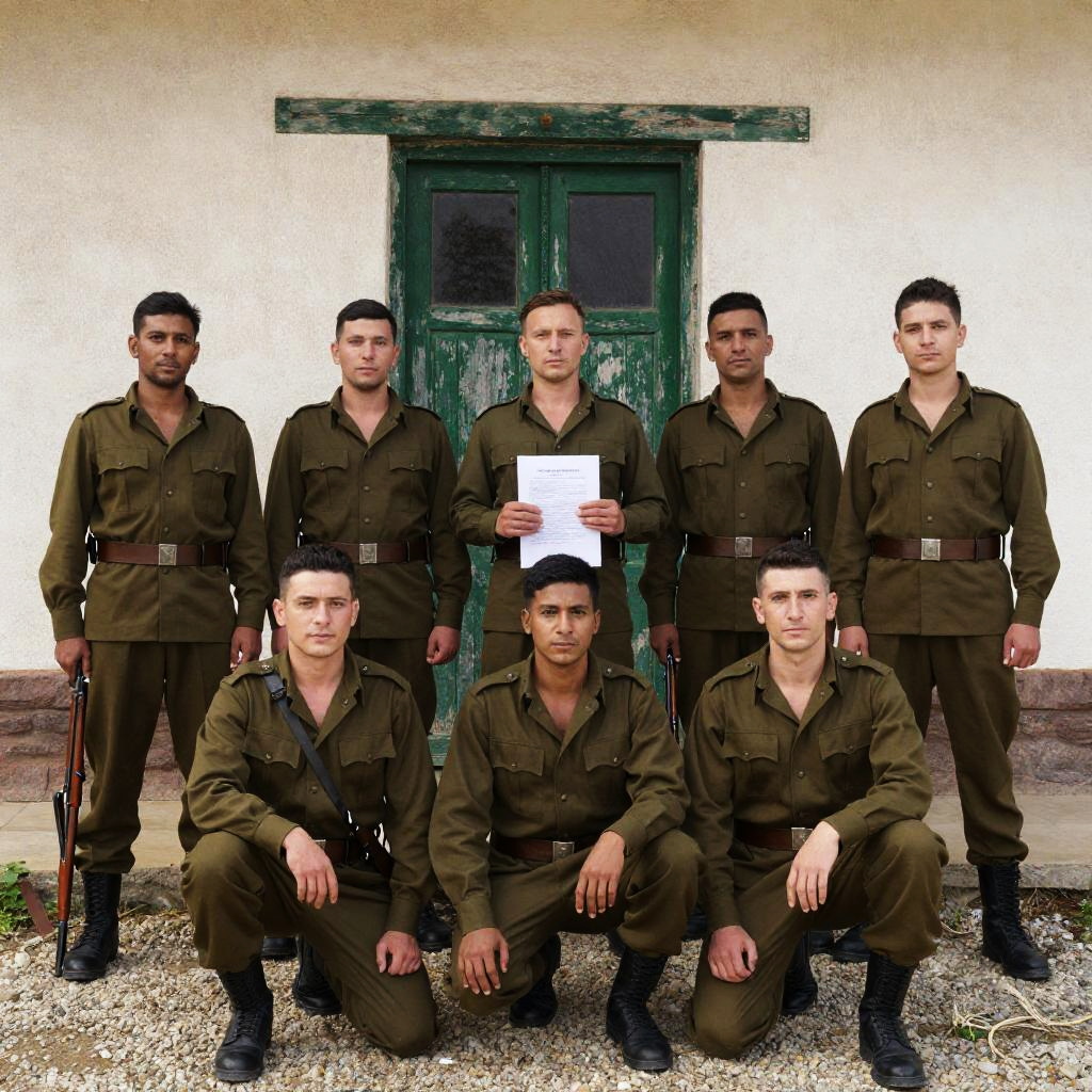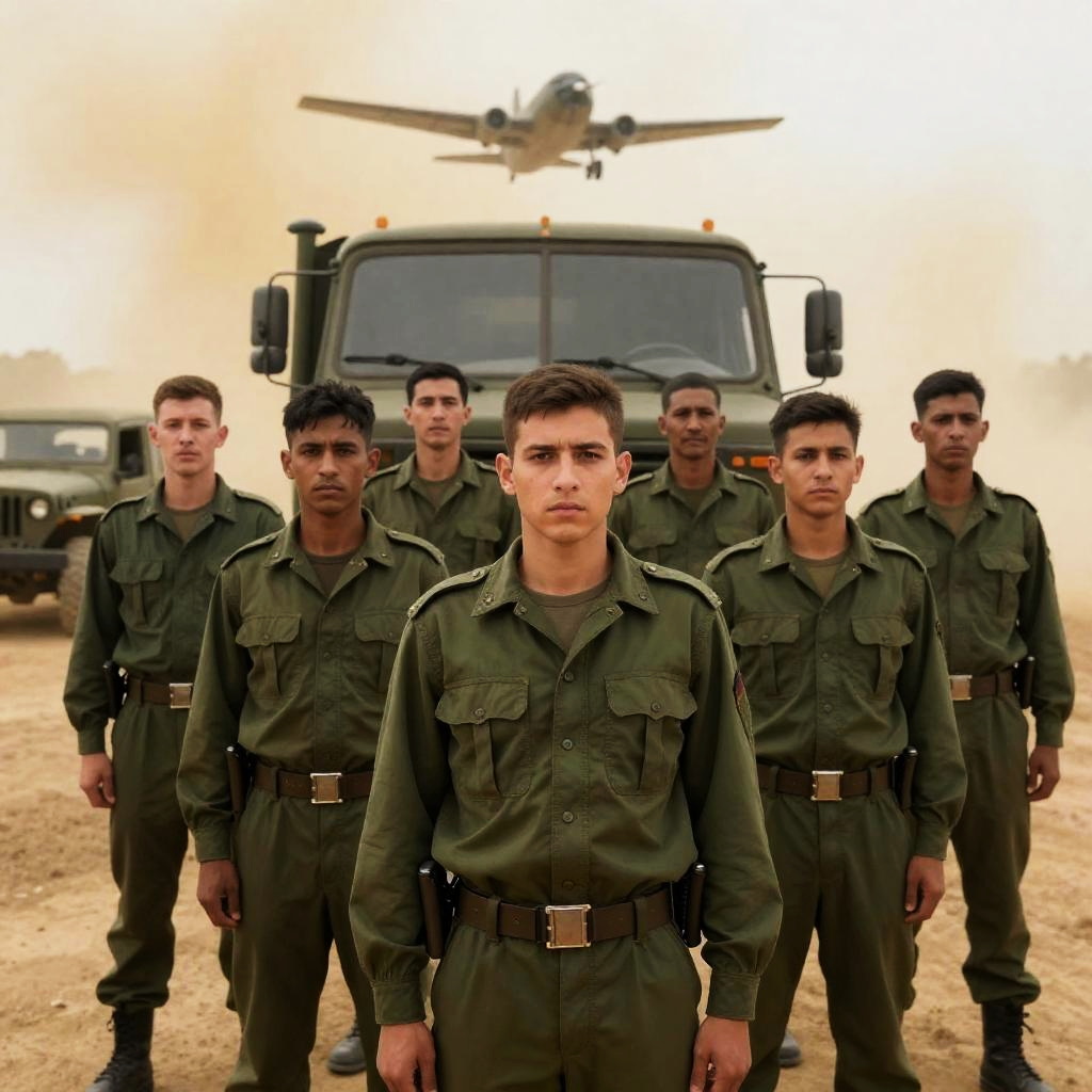 Photograph of seven soldiers in green military uniforms standing in front of a dusty yellow background. Behind them, a large truck, military jeep, and aircraft are visible. The soldiers have serious expressions. The aircraft is flying low in the sky. Dusty ground and smoke in the background. Soldiers are positioned in a semi-circle, with one soldier in the center foreground.