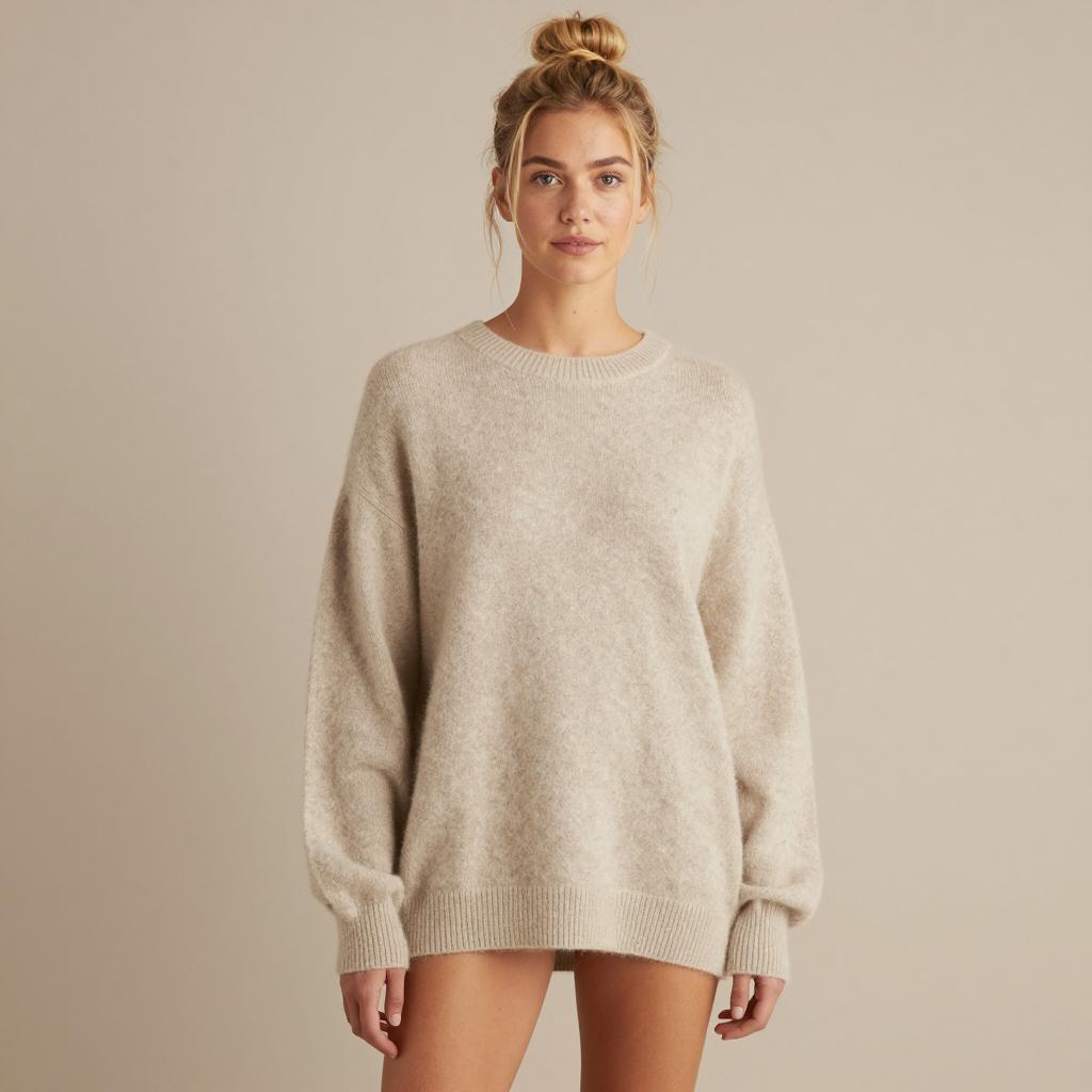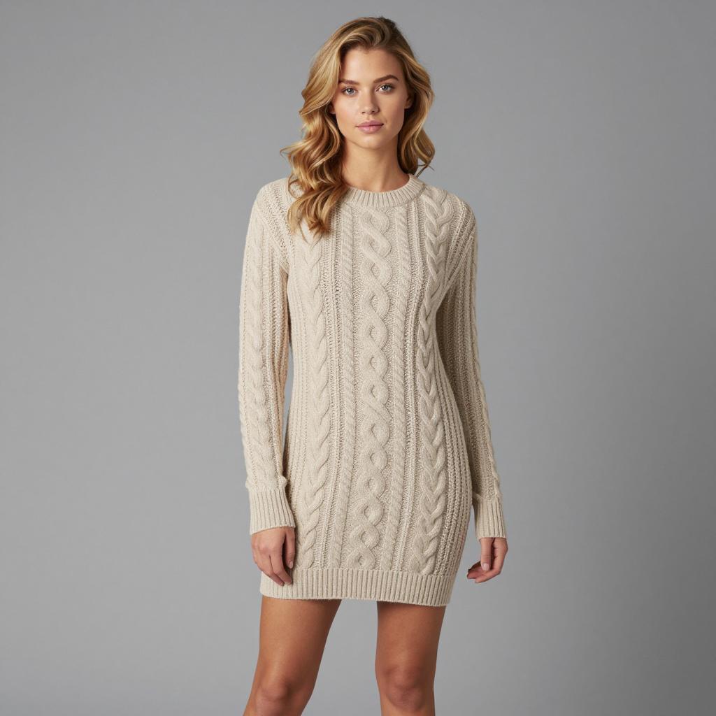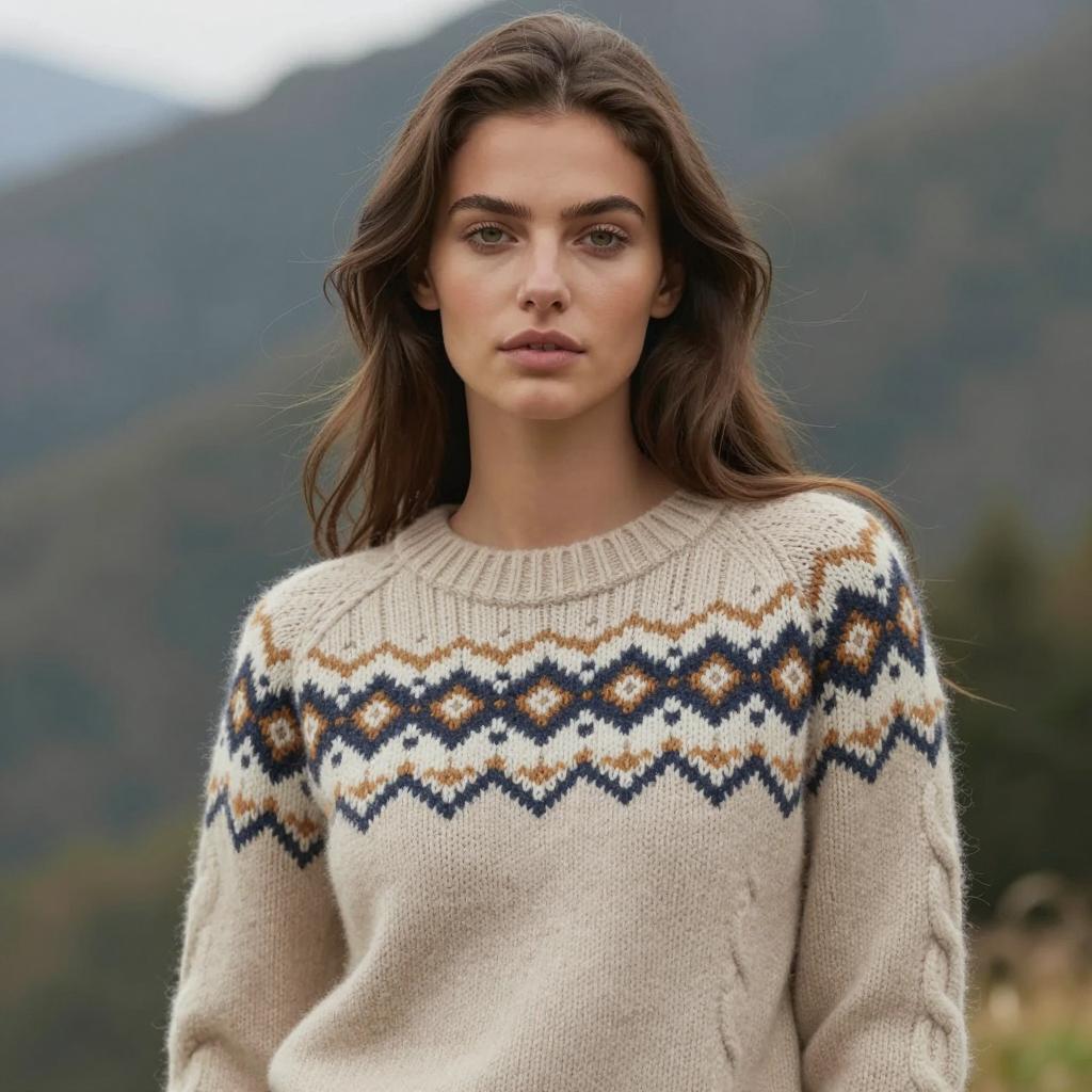 Fairy isle sweater, photorealistic portrait of young woman, long wavy brown hair, green eyes, neutral expression, wearing beige knitted sweater with cable patterns, outdoors, blurred mountain and forest background, natural light, realistic ures, slight breeze in hair, upper body shot, close-up, soft focus, casual style, natural makeup