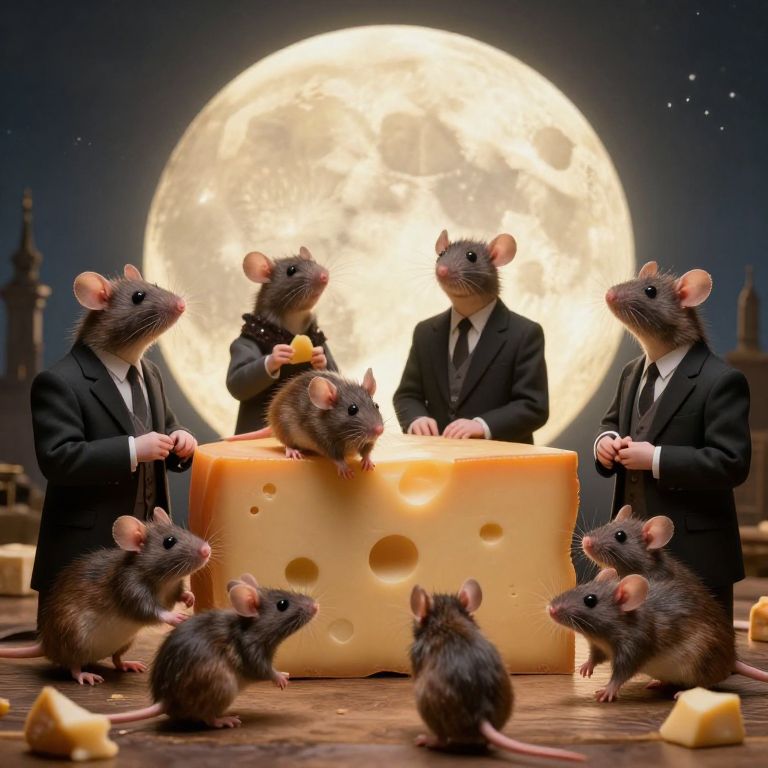 Under the luminous glow of a cheese-moon, a parliament of mice in formal attire debates the moral complexities of abundance, their whispers echoing with the weight of responsibility and the sweet aroma of choice.