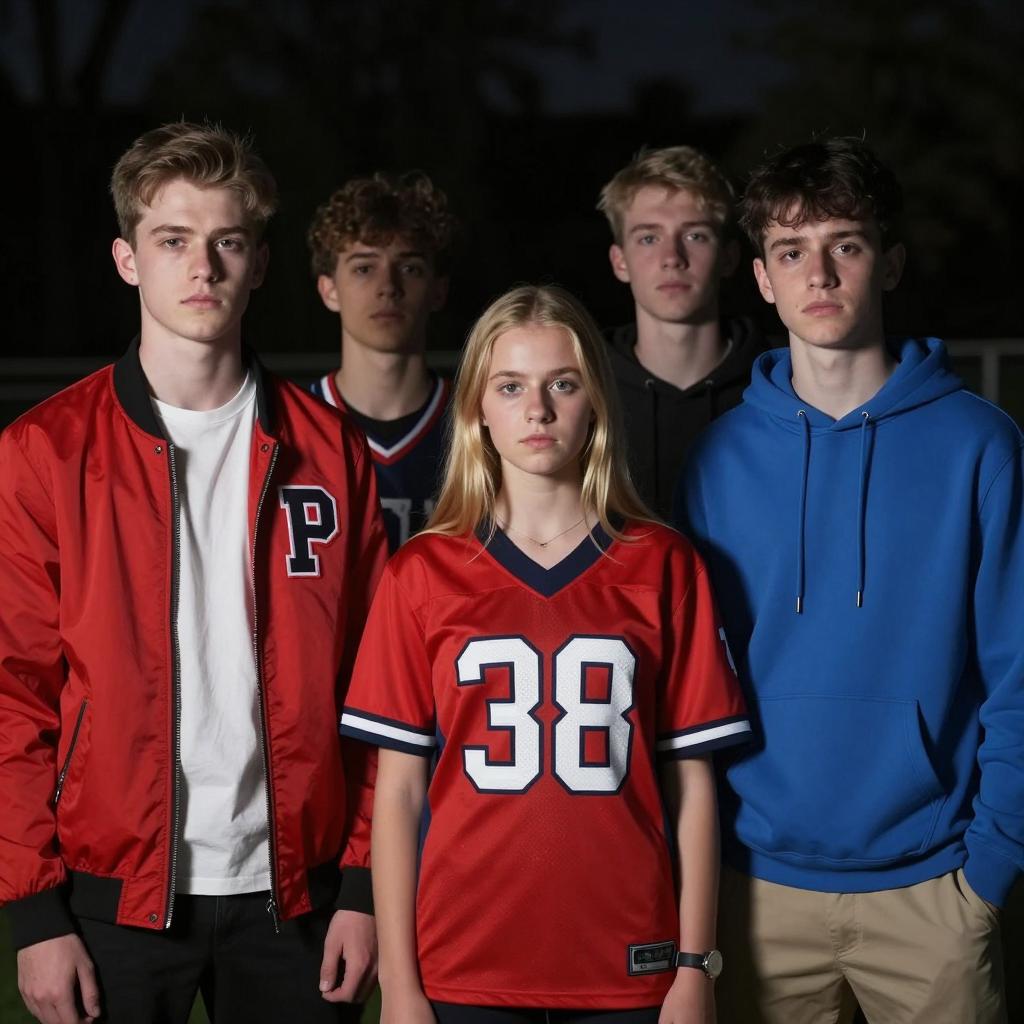 Photograph of four teenagers standing in dim light. Male in red jacket with "P" on left, intense gaze. Blonde female in red 38 jersey, serious expression. Dark-haired male in blue hoodie, calm expression. Background shows blurred figures and trees.