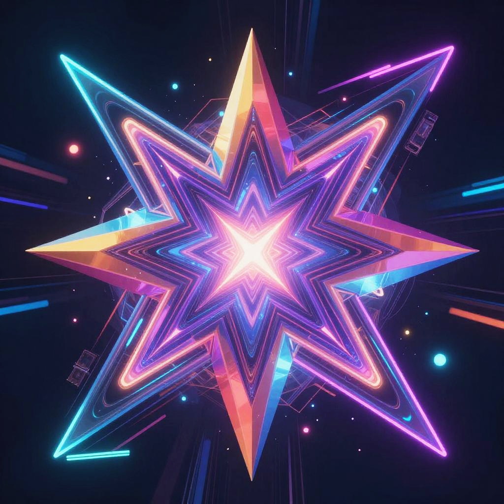 This digital CGI image features a vibrant, neon-colored starburst with multiple overlapping layers. The central star is bright white, surrounded by layers of glowing, multicolored lines in pink, blue, purple, and yellow. The starburst has a sharp, angular design with each layer slightly offset, creating a dynamic, three-dimensional effect. The background is dark blue, dotted with small, colorful lights in pink, blue, and purple, adding to the sense of depth and motion. The overall style is reminiscent of retro 80s neon artwork, with a futuristic, cyberpunk aesthetic. The image has a high-contrast, luminous quality, emphasizing the glowing neon lines against the dark backdrop.