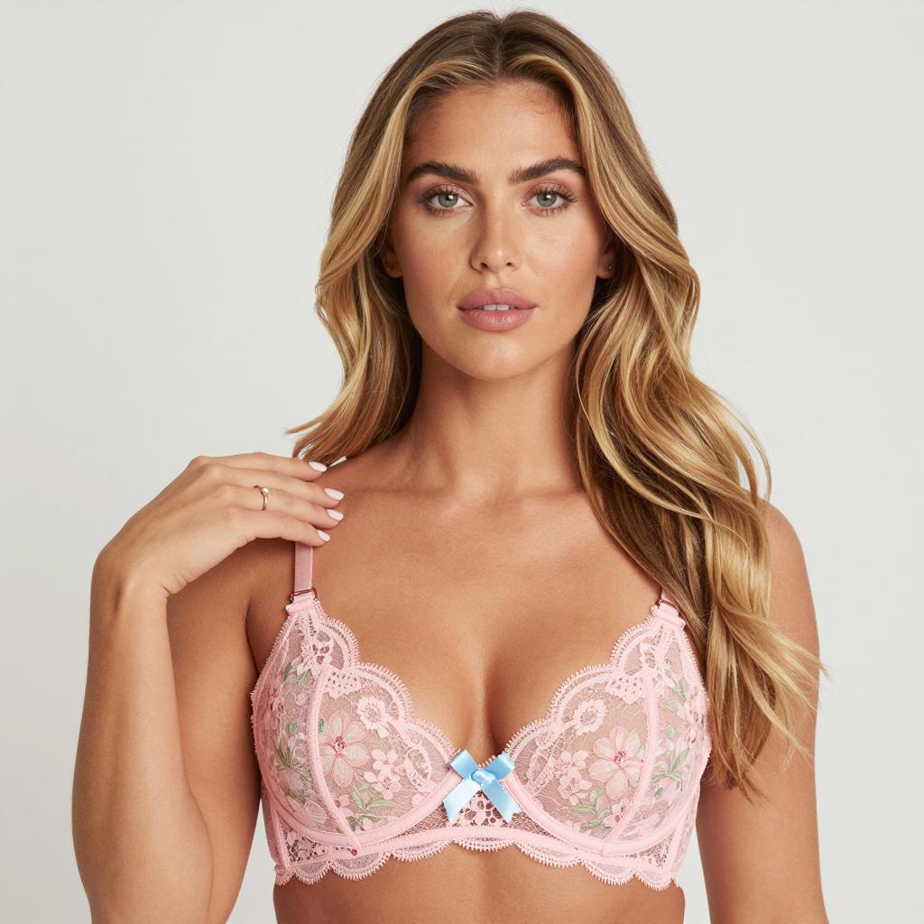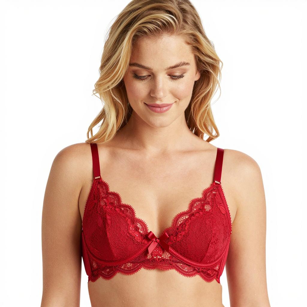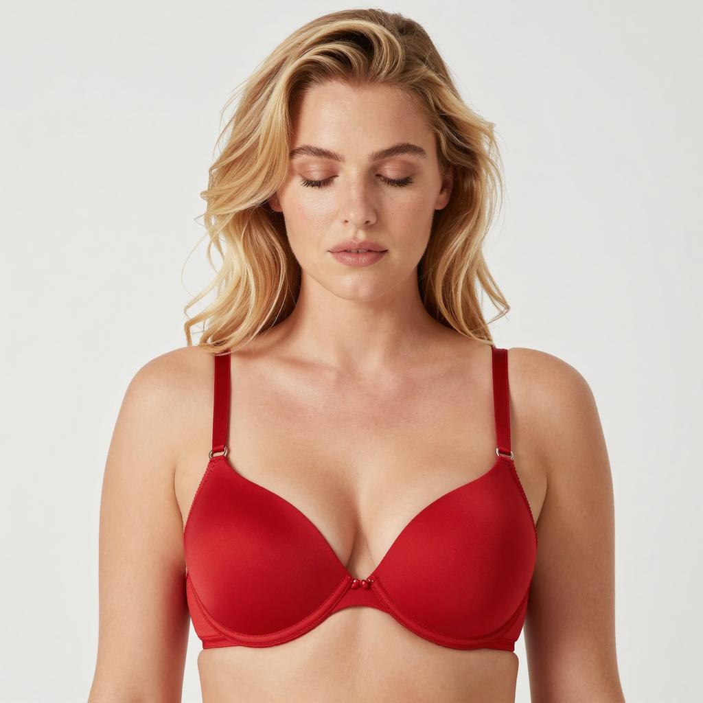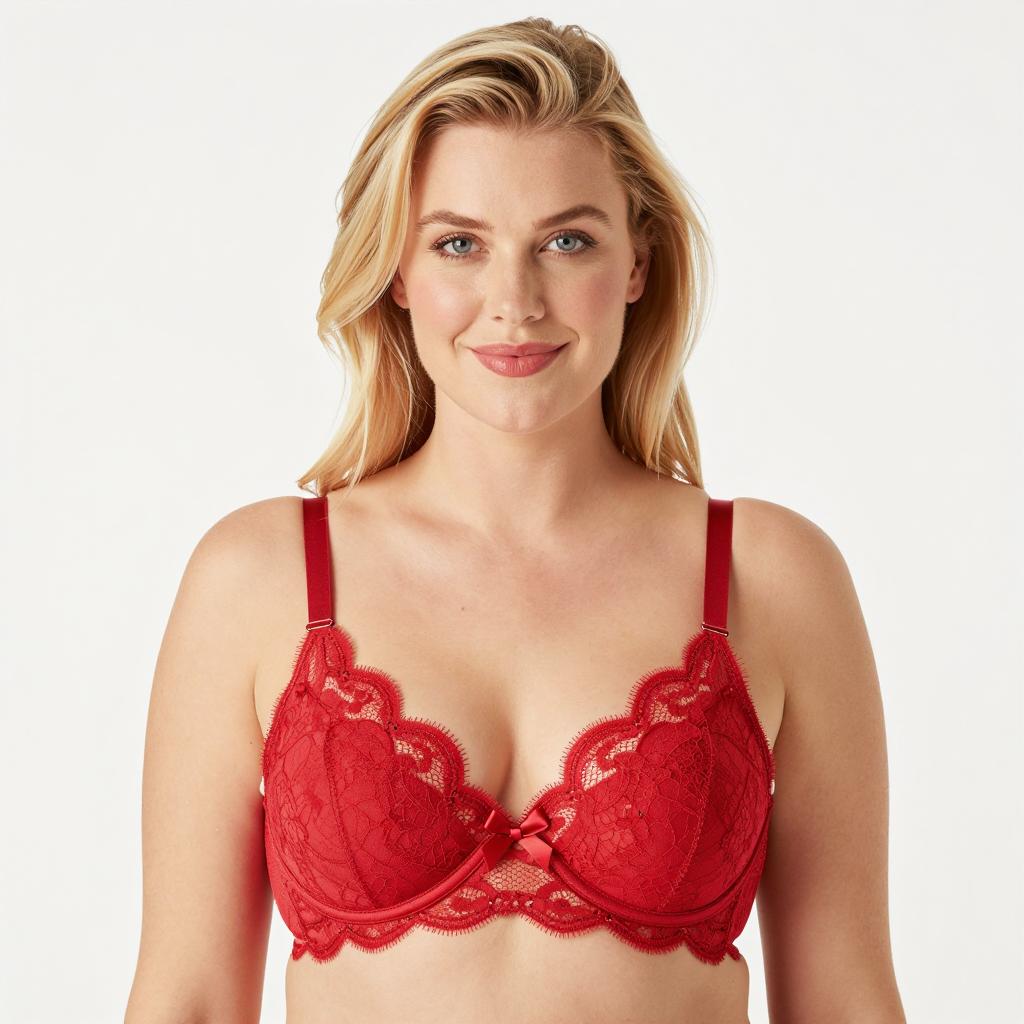 Photograph of a blonde woman with long hair, looking down, wearing a red sports bra with lace ure, large breasts, fair skin, and a white background. She has a slight smile and relaxed pose. Light shadows on her right side.