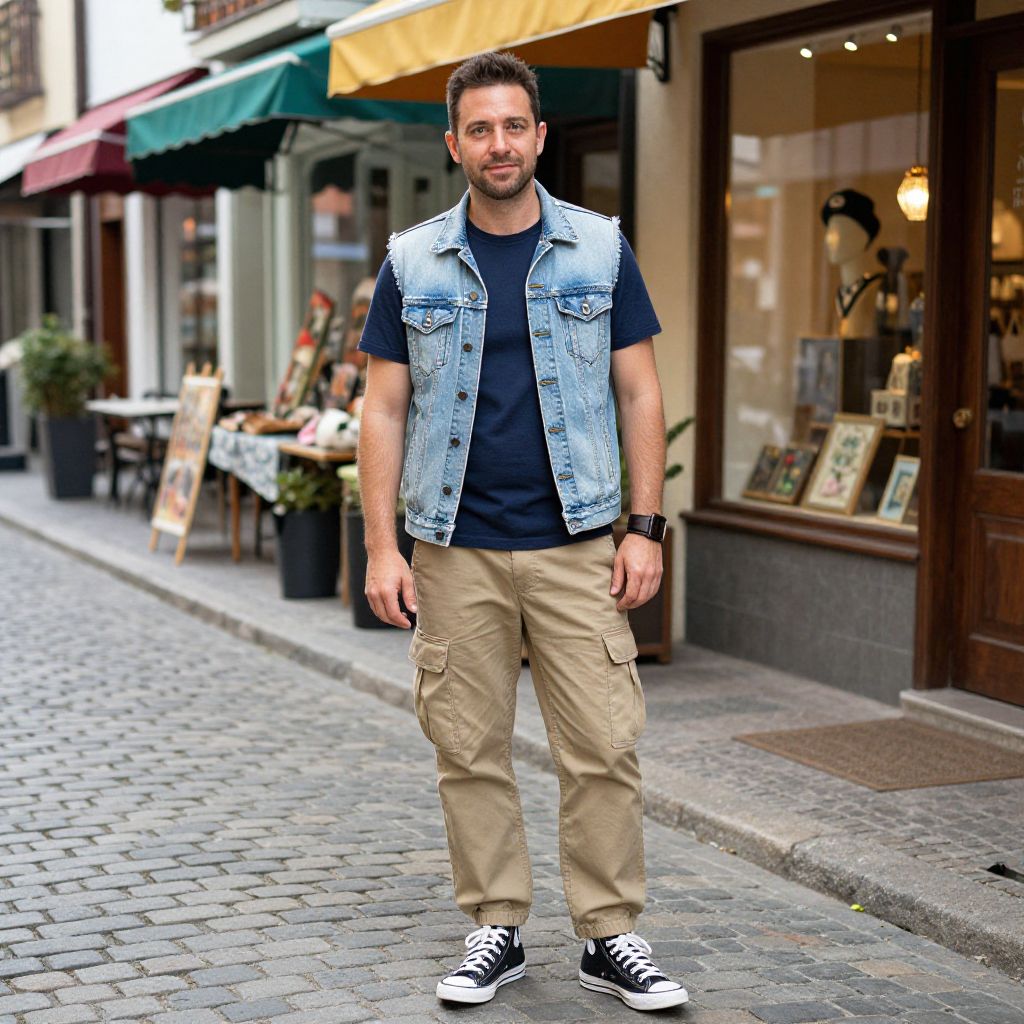 A man, light wash denim vest, khaki cargo pants, navy blue crew neck t-shirt, black high-top sneakers, leather wristband, charming cobblestone street, colorful awnings fluttering, artisanal window displays, kodachrome analog film, relaxed smile, casual confidence. Man has masculine face and piercing eyes