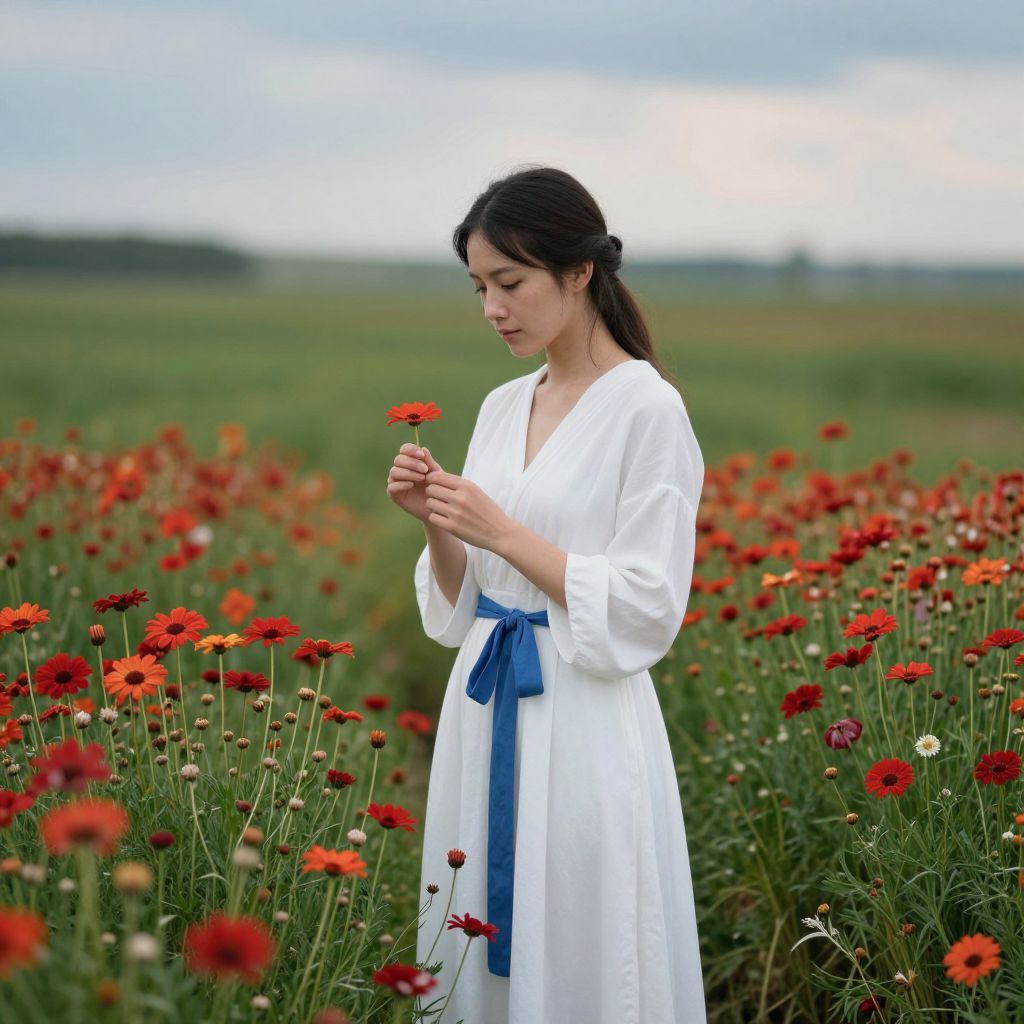 Woman in a serene field of vibrant red daisies, holding a single flower with delicate care, her gaze directed downward in contemplation, dressed in a flowing white gown with a blue sash, set against a backdrop of lush greenery and a soft, cloud-dotted sky.