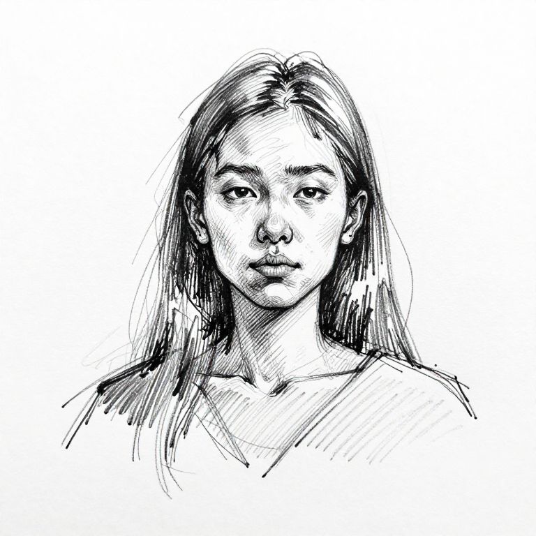 This is a black-and-white digital sketch of a young woman with straight, long hair that falls past her shoulders. She has a neutral expression, with slightly parted lips and soft, almond-shaped eyes. Her eyebrows are subtly arched, and she has small, rounded ears. She is wearing a simple, V-neck top. The sketch uses fine, cross-hatching lines to create texture and depth, giving her hair and facial features a realistic yet stylized appearance. The background is entirely white, making the subject the focal point. The overall style is reminiscent of traditional ink drawings, with a focus on detailed line work.