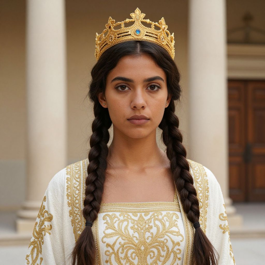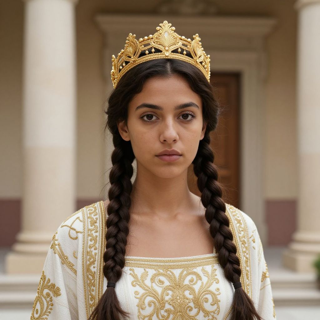 Photograph of a young woman with medium brown skin and dark brown eyes, wearing an intricate gold crown and a white, ornately embroidered robe with gold patterns. She has two long, dark brown braids and a serious expression. The background shows a classical architecture with beige columns and a wooden door. The overall vibe is regal and historical.