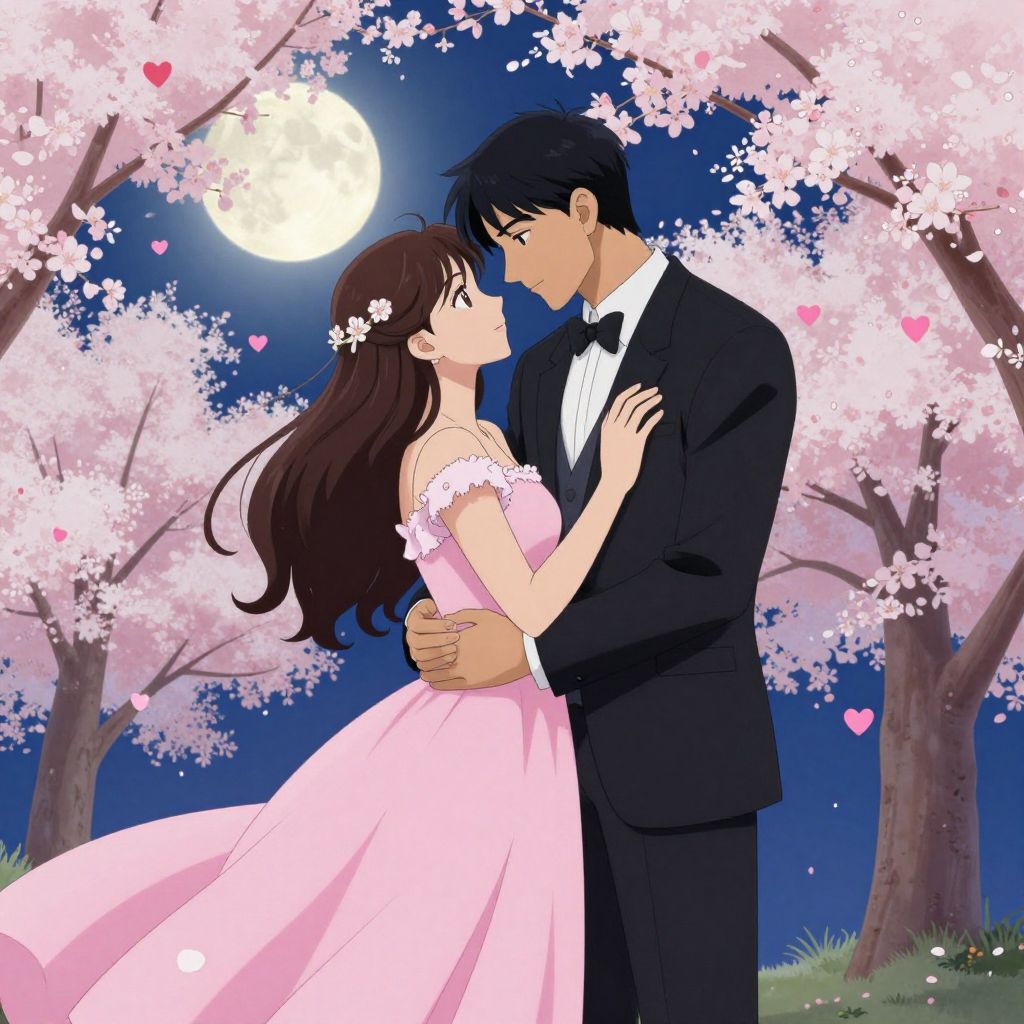 Romantic anime-style artwork depicts a tender moment between a woman in a flowing pink dress and a man in a formal black suit, framed by a full moon and blossoming cherry trees adorned with floating hearts.