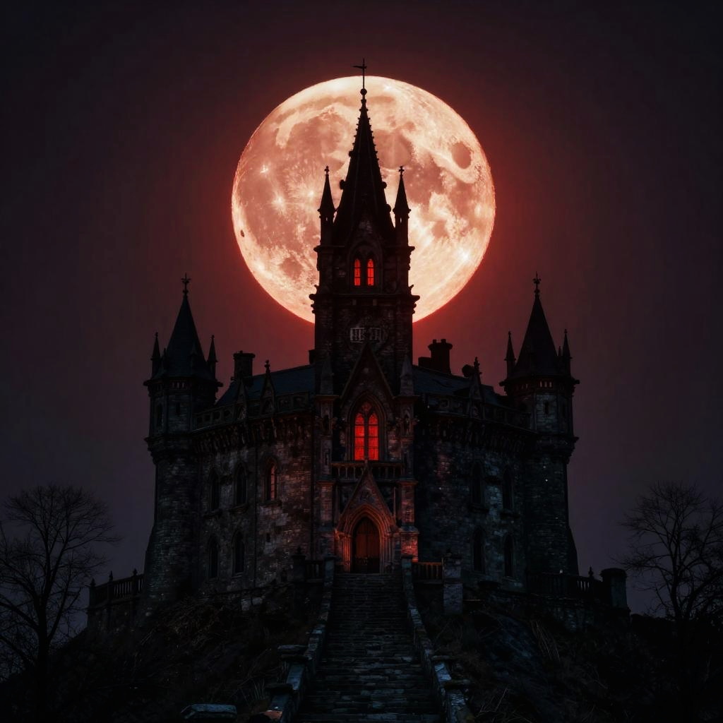 Red Haloed Moon Over Gothic Castle