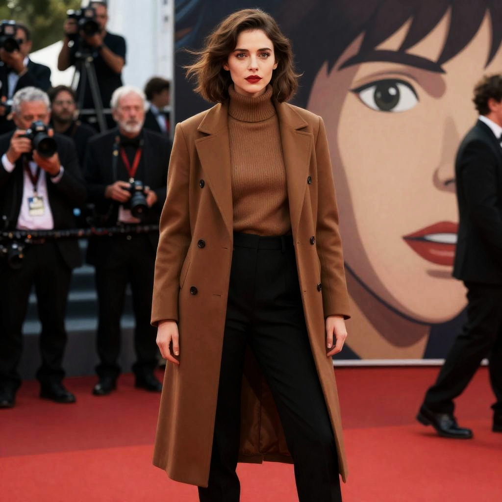 Photorealistic portrait of a woman standing on the red carpet at a Comic Con event. She has short brown hair styled with wind effect, wearing a long brown coat over a matching turtleneck sweater and black trousers. The scene includes photographers in the background and a large animated artwork poster. The woman has striking red lips and detailed eye makeup, exuding a modern and elegant style.