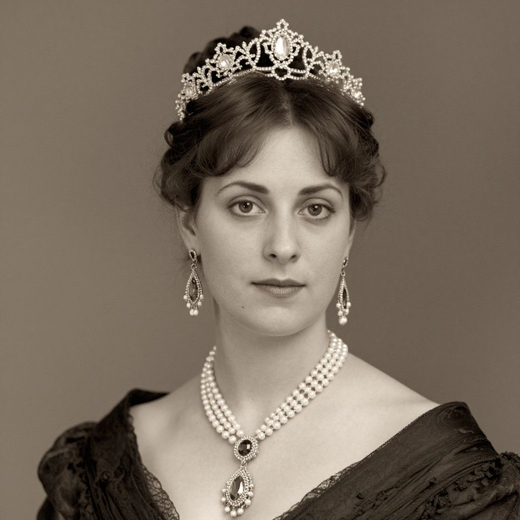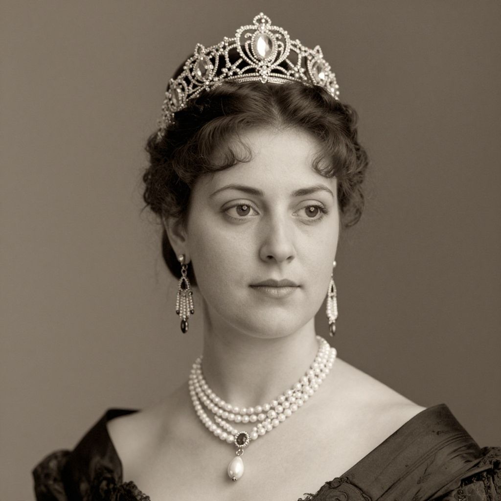 Elegant portrait of a Victorian-era woman adorned with intricate jewelry, including a pearl necklace, dangling earrings, and a delicate tiara, set against a sepia-toned backdrop that evokes the timeless charm of 19th-century photography.