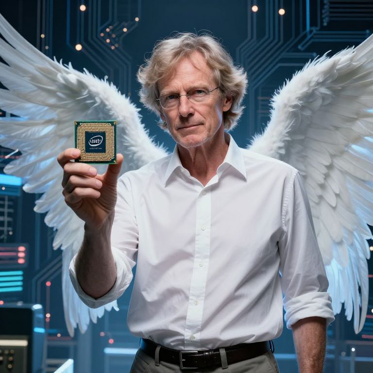 Slick Gordon Moore become an angel, holding an Intel CPU, background full of circuits, volumetric lighting,