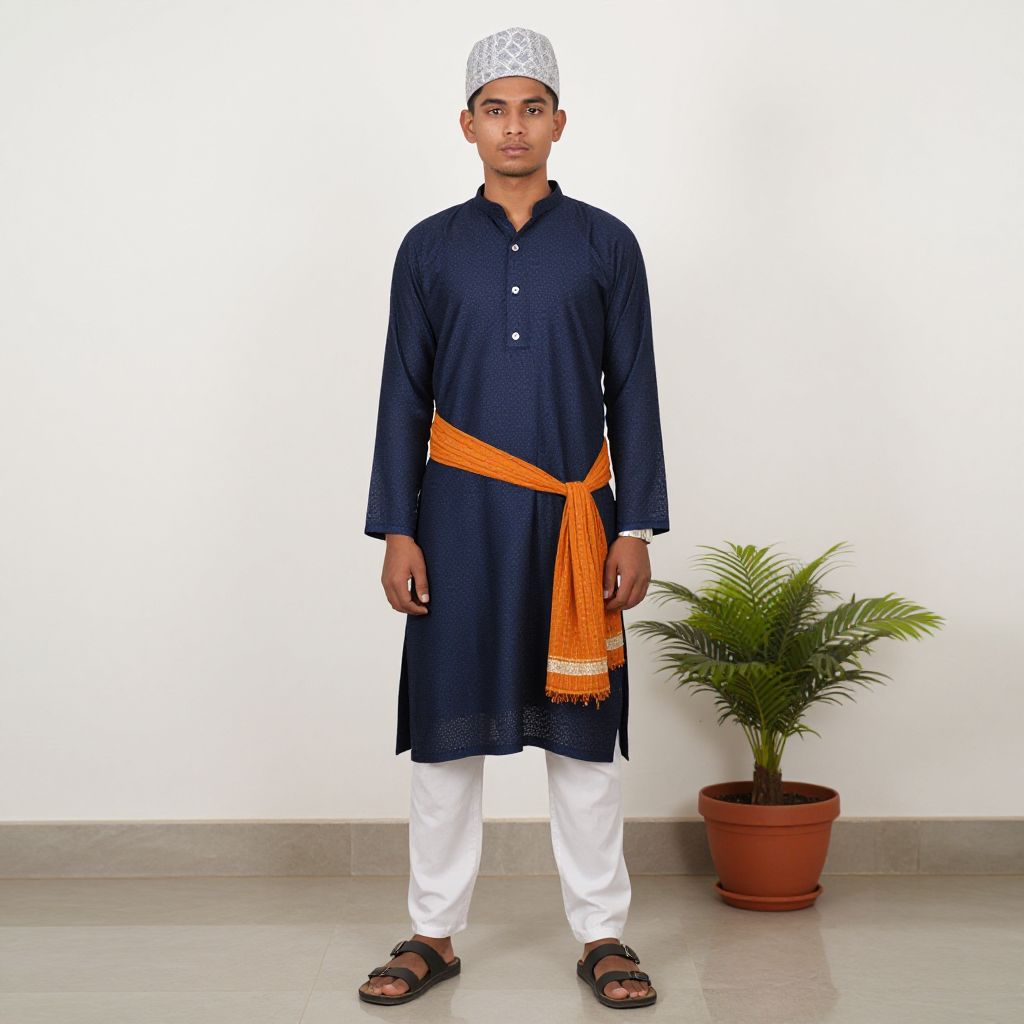 Photograph of a South Asian man with a medium build, dark skin, and short beard, wearing a white traditional outfit and cap, barefoot,