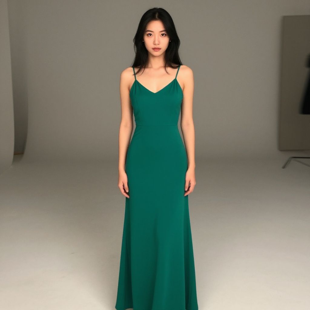 Photograph of an Asian woman with long black hair, standing against a plain white background. She wears a sleeveless, floor-length, emerald green dress with a V-neckline. Her expression is neutral, and she gazes directly at the camera. The dress's fabric is smooth and flowy, complementing her slim figure. The lighting is even, with no visible shadows, highlighting her delicate features and the dress's rich color. In the background, there is a partially visible gray object on the right and a hint of a doorway on the left.