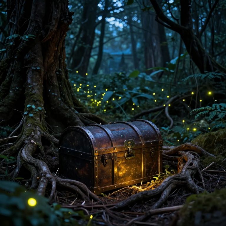 Burying an ancient treasure chest in a dense, mystical forest at twilight, surrounded by glowing fireflies and twisted roots, cinematic lighting, high detail, fantasy art style