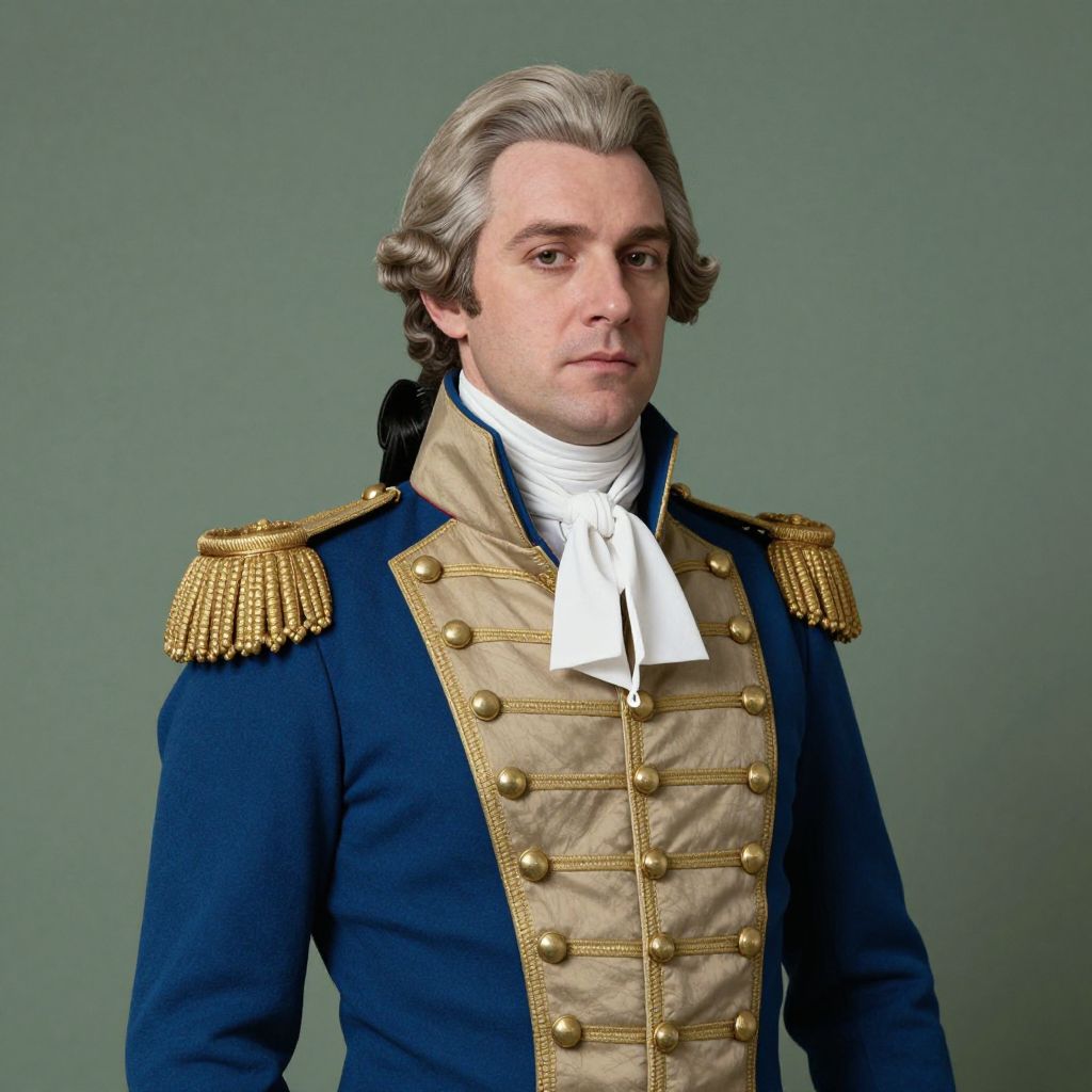 The image depicts a character dressed in a detailed, historical military uniform, reminiscent of the 18th century. The uniform is predominantly blue with gold accents, featuring a high collar and epaulettes adorned with gold braid. A white cravat is tied around the neck, adding a touch of elegance to the attire. The character's hair is styled in a manner typical of the period, with a side part and waves. The background is a solid, muted green, which contrasts with the vibrant colors of the uniform, making the character stand out prominently. The overall composition is balanced, with the character centrally positioned and the uniform's intricate details clearly visible.