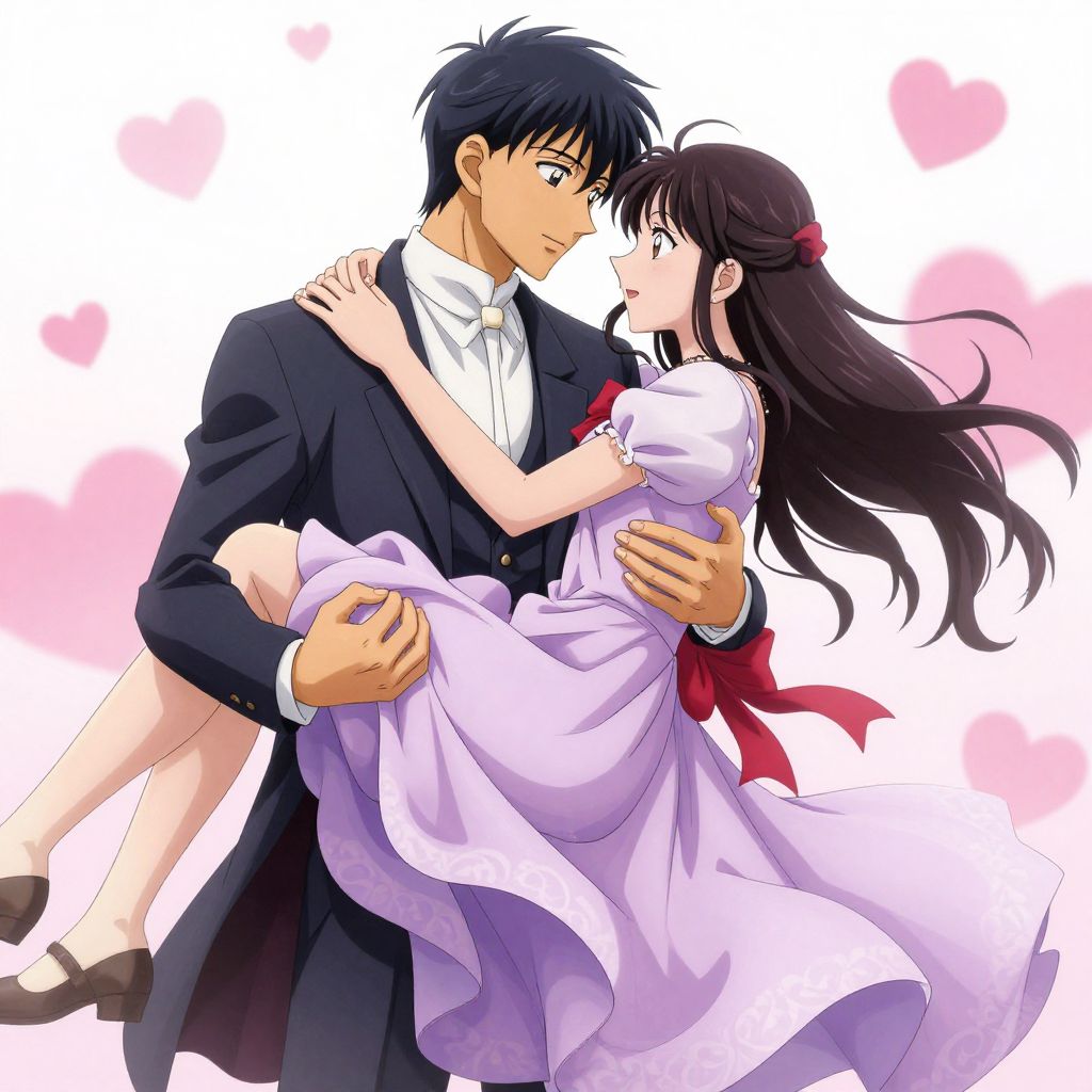 Romantic anime characters embrace tenderly against a backdrop of floating pink hearts, with the man in a formal suit cradling the woman in a flowing lavender dress adorned with a red bow.