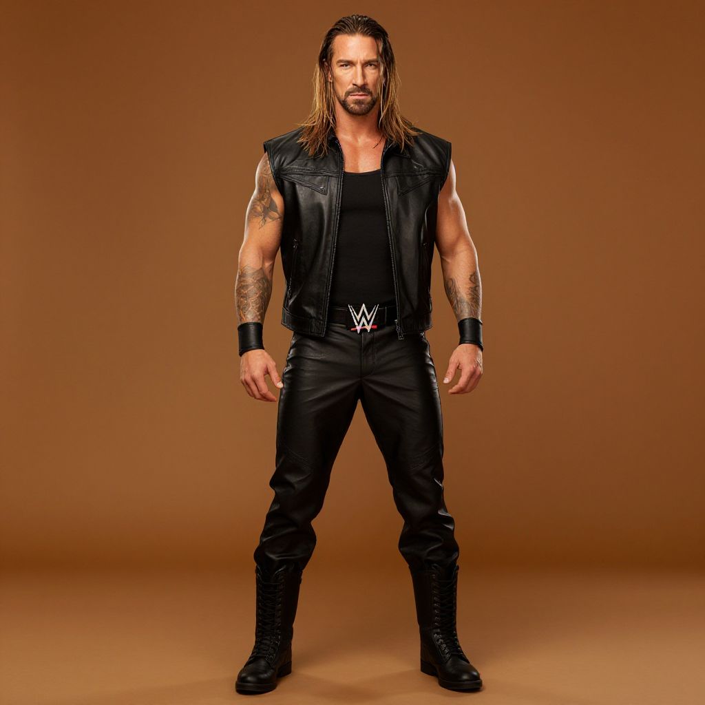 "Wwe Roman Reigns Outfit, a man in a black leather outfit standing in front of a brown background"