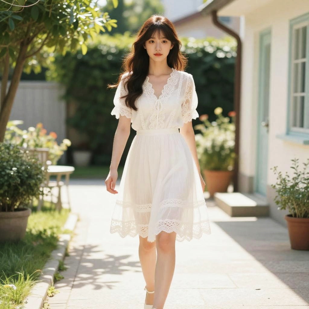 In this charming scene, a young woman confidently strolls through a sunlit pathway, dressed in a delicate, lace-trimmed white dress that captures a whimsical, vintage aesthetic. The vibrant surroundings, with lush greenery and quaint architecture, create a serene backdrop, enhancing the overall romantic vibe of the image.