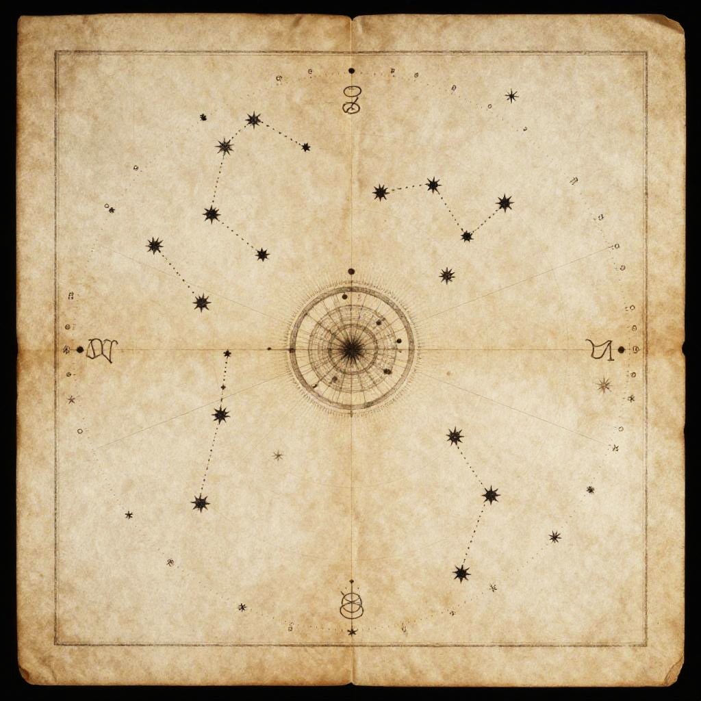 Orion constellation drawing as an ancient celestial map on parchment paper with intricate star connections and hand-drawn zodiac symbols, vintage astronomy theme.