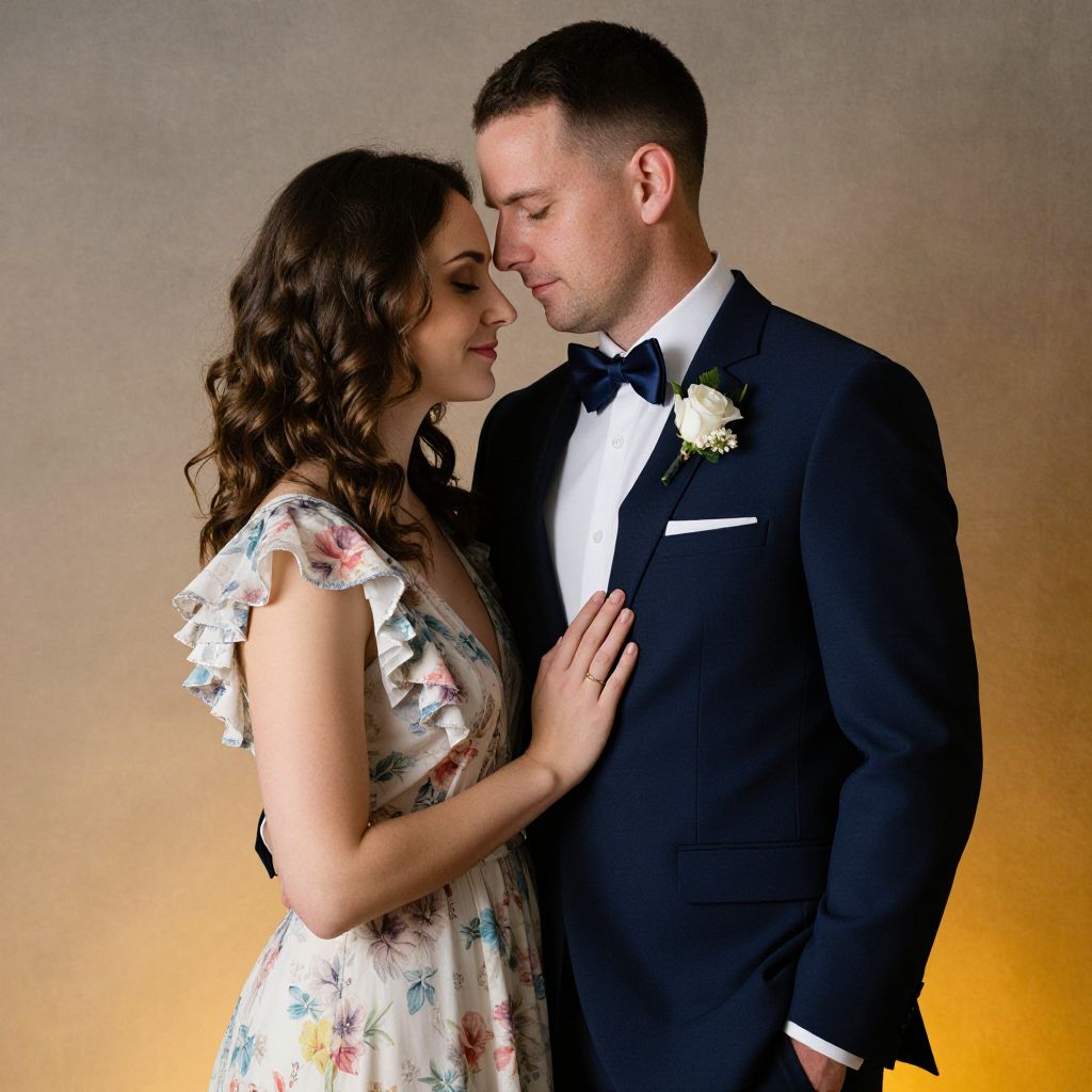 Elegantly dressed couple sharing a tender moment, with the woman in a floral-patterned dress adorned with ruffled sleeves and the man in a navy suit complemented by a bow tie and boutonniere, set against a textured backdrop with warm, golden accents.