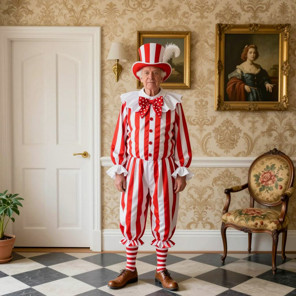 Adult tweedle dee dum, photo of an older man, standing in an elegant room, wearing a red and white striped jester outfit with ruffled sleeves, red and white polka dot bowtie, red and white striped top hat with feather, red and white striped knee-length puffy pants, red and white striped socks, brown shoes, ornate wallpaper, checkered floor, two framed paintings on the wall, white door with arched top, wall-mounted lamp, small potted plant in the corner, antique chair with floral upholstery on the right, vintage wallpaper pattern, baroque style, brightly lit room, realistic photography style