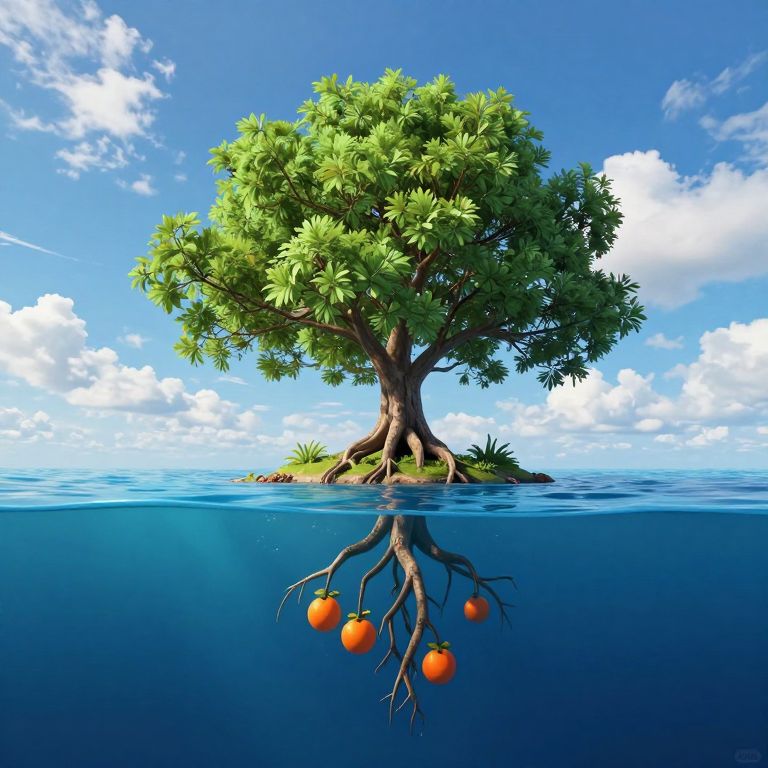 A solitary tree stands atop a small island, its lush green canopy contrasting against the azure sky and scattered clouds, while its roots extend downward into the deep blue ocean, bearing vibrant orange fruits that float serenely beneath the water's surface.