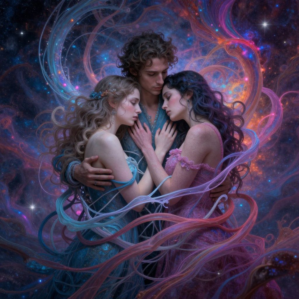 A digital fantasy artwork depicts a curly-haired man with a blue shirt, standing between two women with flowing hair and ethereal dresses. The woman on the left has blonde hair and wears a blue dress, while the woman on the right has dark hair and a pink dress. They gaze at each other, hands on his chest, surrounded by vibrant, swirling colors of purple, pink, and blue, resembling a cosmic background with stars. The composition is intimate and mystical, with a dreamlike, otherworldly quality. The women's dresses and hair blend into the colorful, swirling patterns.
