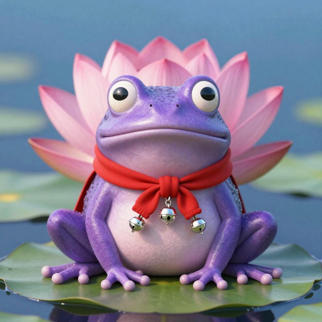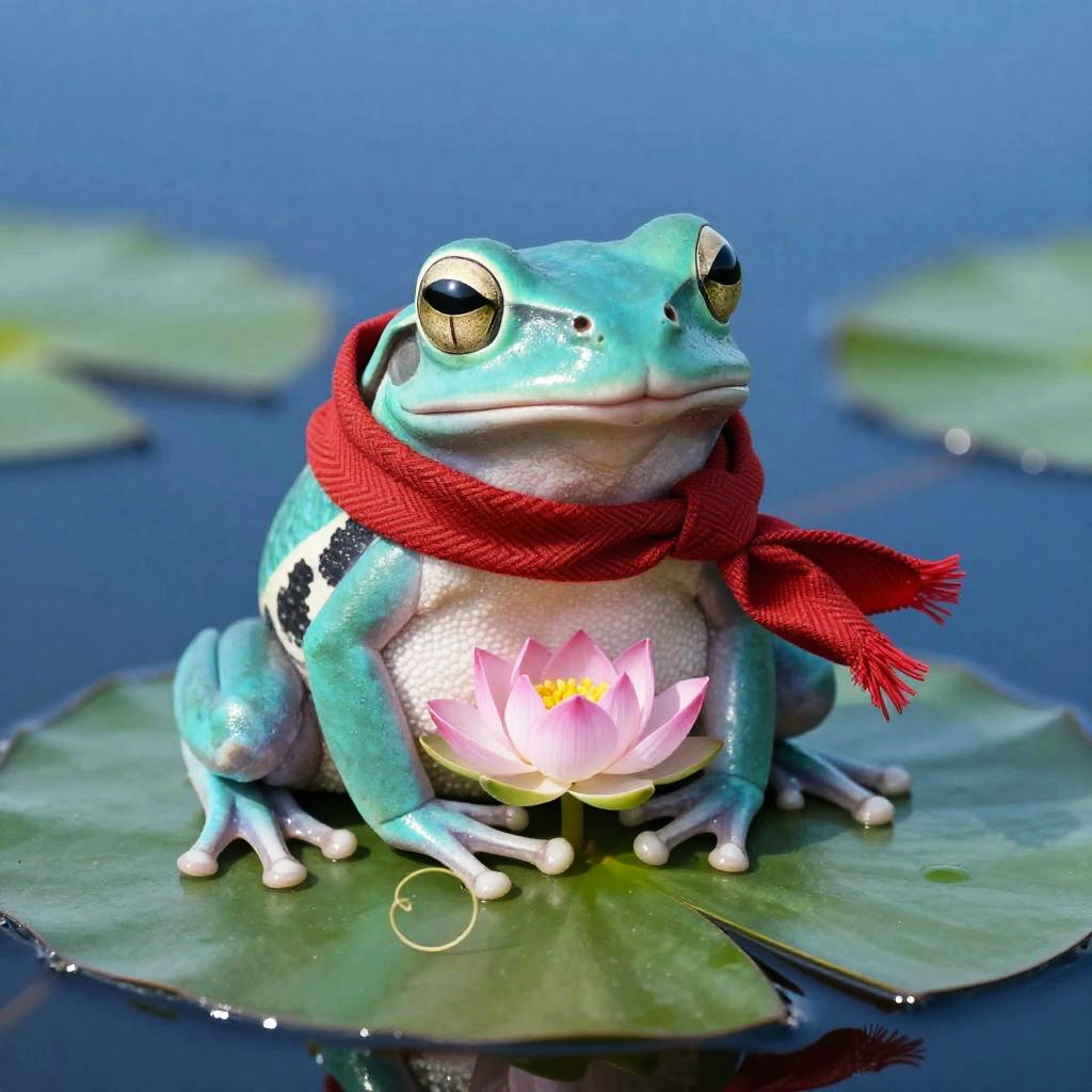 Full body, animal focus, frog, sitting on a lily pad, light olive frog with pearly matte skin and golden under-tint, red scarf, trimmed with fine red tassels hanging delicately, lotus, pink flower, curling one leg playfully while glancing aside, blue background