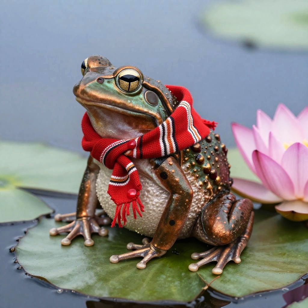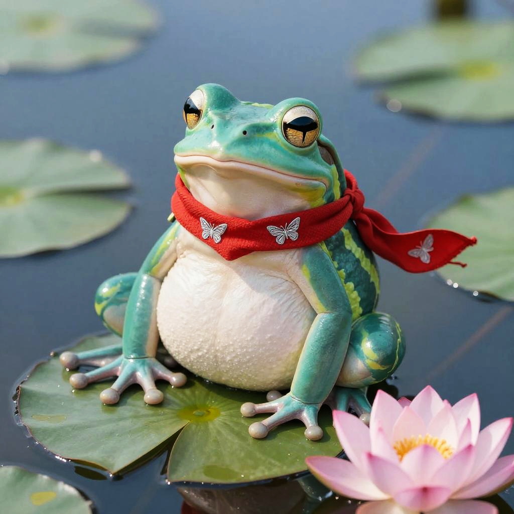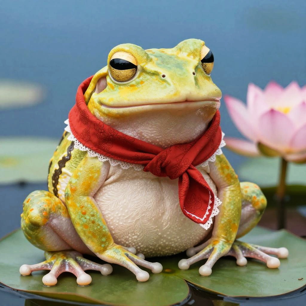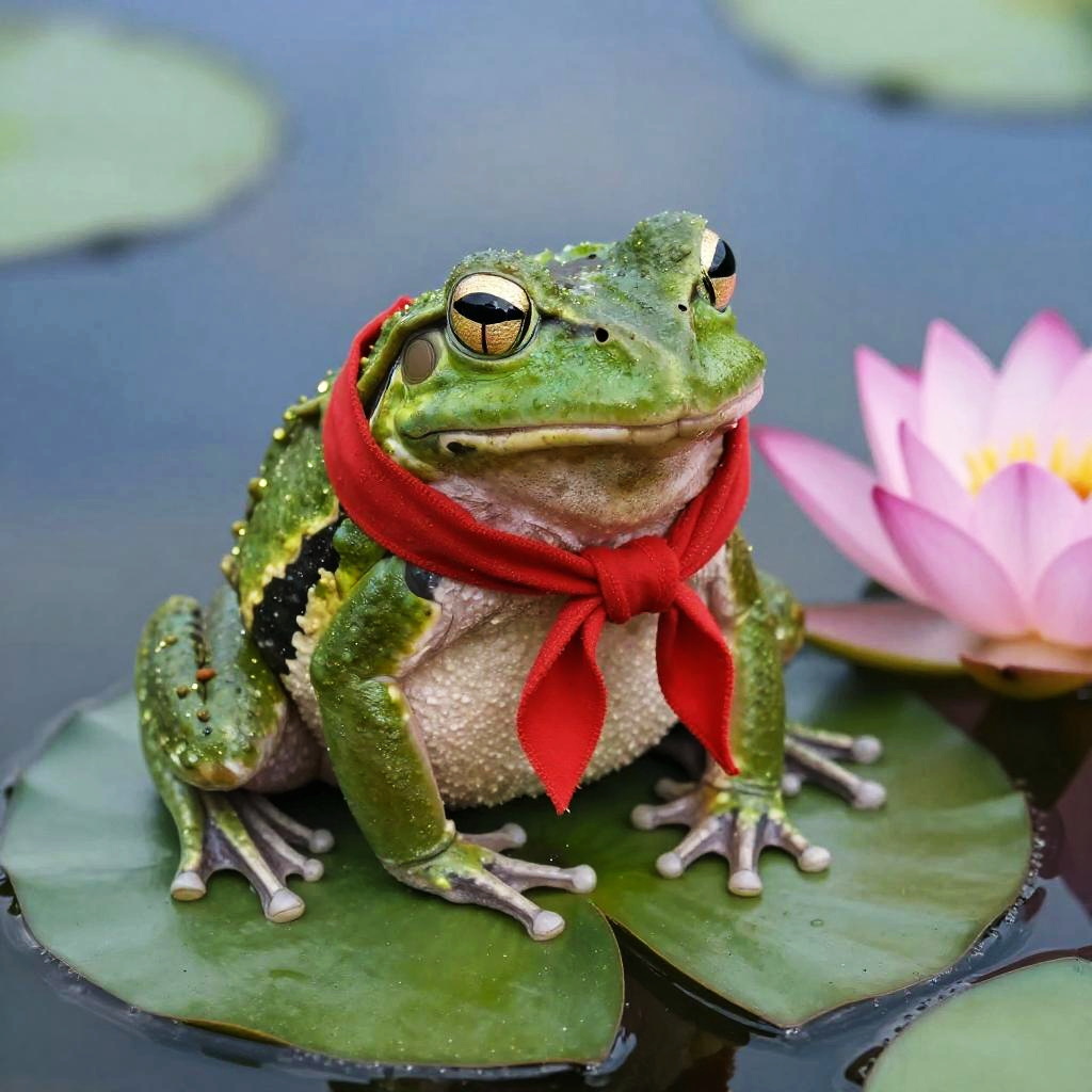 Photograph of a green frog with yellow spots, wearing a bright red scarf, sitting on a lily pad, with a pink lotus flower in
