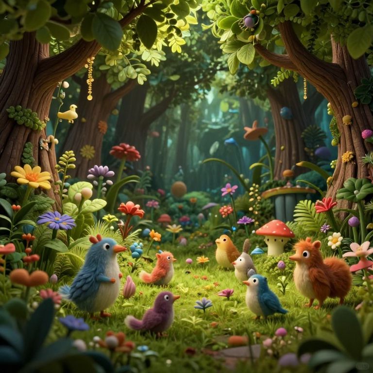Whimsical CGI forest scene with colorful, fluffy birds and mushrooms, vibrant flowers, lush greenery, and soft sunlight filtering through trees.