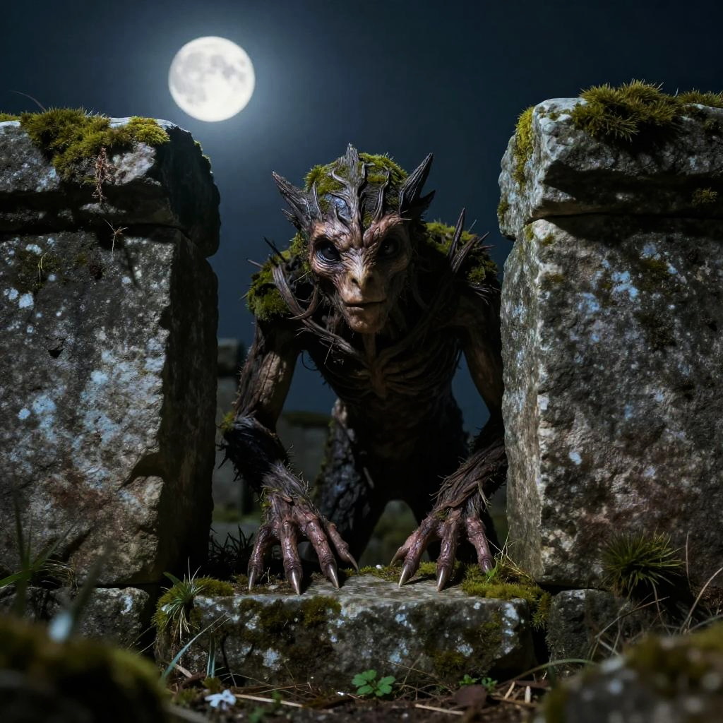 A shulking creature hiding behind ancient stone ruins under a moonlit sky, blending into the environment with a skin textured like moss and bark, its stealthy posture suggesting it waits for the perfect moment to emerge, mystical and atmospheric.
