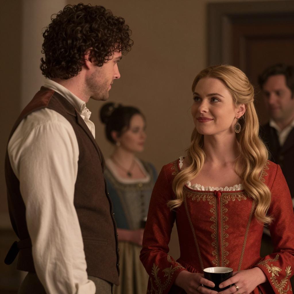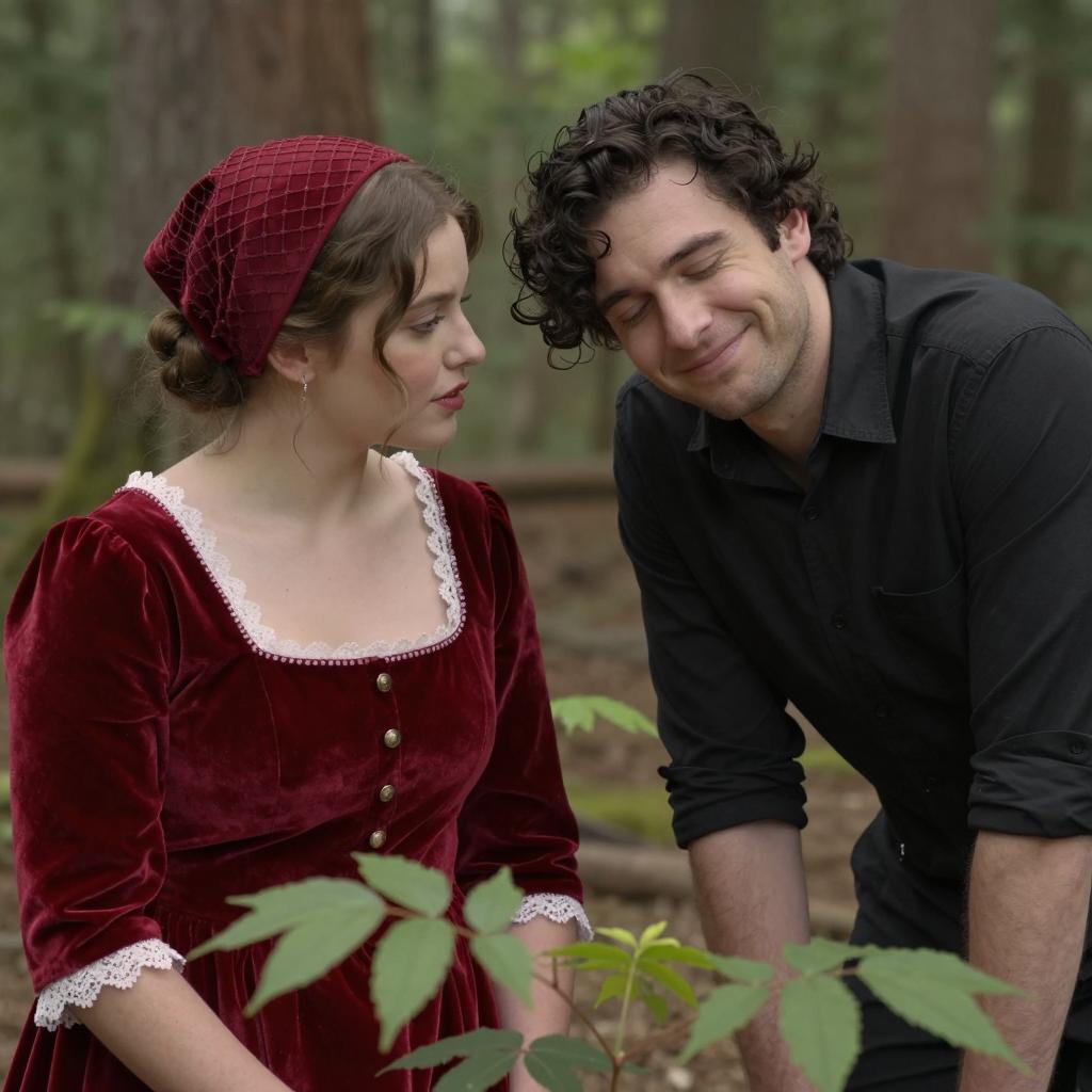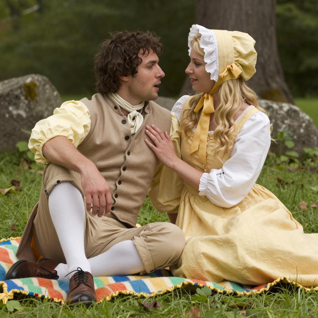 A man and woman outdoors, wearing 18th-century-style clothing. The man has dark hair, tan vest, yellow shirt, and beige pants. The woman has blonde hair, yellow bonnet with yellow ribbons, white sleeves, and yellow dress. She leans towards him, touching his chest. They sit on a colorful blanket with green foliage and rocks in the background. The man looks at her with an open mouth. The woman looks at him with a slight smile. Both are on grass, with trees in the background.