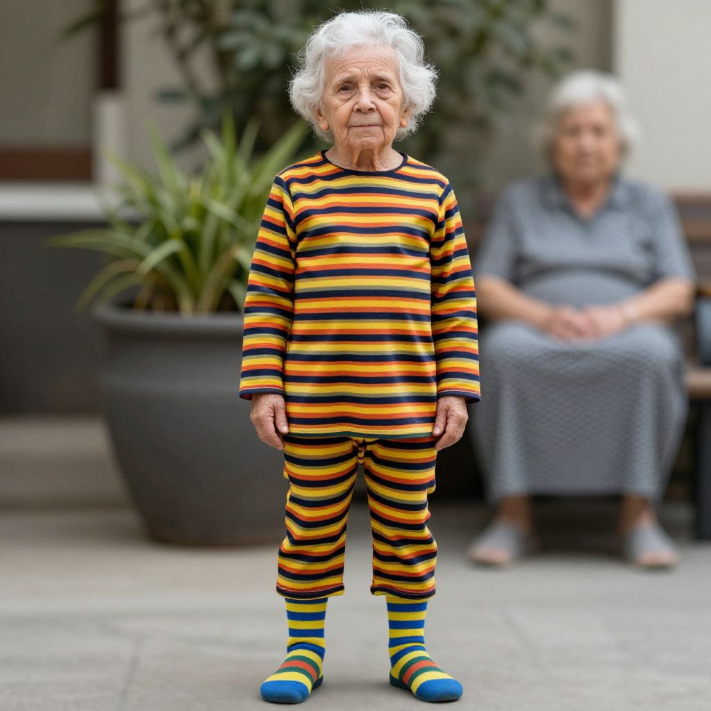 Gangsta granny costume, solo, old, 1boy, male focus, old man, striped socks, standing, full body, outdoors, blurry, pants, blurry background, old woman, closed mouth, plant, long sleeves, striped clothes, looking at viewer, socks
