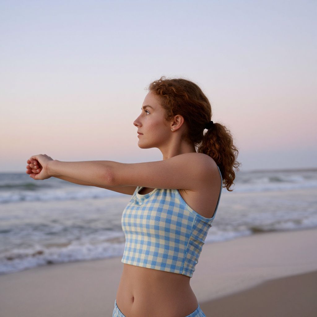 A healthy, athletic woman with toned limbs and curly auburn hair in a side ponytail wears a light blue and cream gingham crop top. She’s standing at a coastal beach during early morning, the waves gently lapping at the shore, the sky painted with soft pastel hues, her face showing a serene and energetic expression as she stretches her arms toward the horizon.