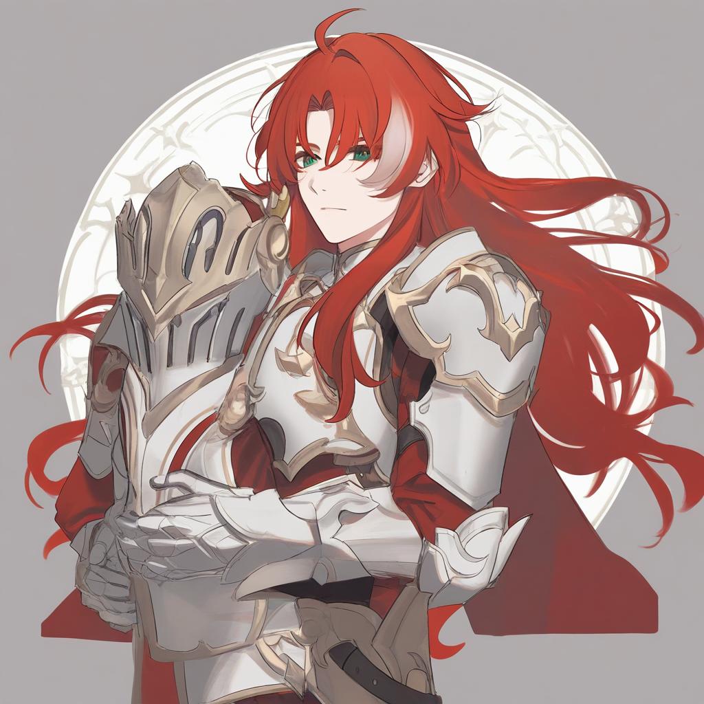 Argenti (honkai: star rail), honkai: star rail, 1boy, green eyes, hair between eyes, red hair, long hair, curtained hair, streaked hair, ahoge, parted bangs, white armor, knight, gauntlets, knight, pauldrons, breastplate, by artist kippu, leet