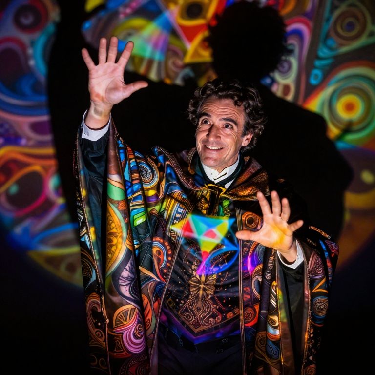 Imagine a captivating, photorealistic portrait of a skilled magician as they perform, captured from an aerial perspective, slightly above and behind. Their face is a study in concentration and amusement, with wrinkles around the eyes hinting at a wealth of experience. Adorned in a traditional cloak, intricate patterns dance across the fabric, animated by dynamic stage lighting, casting intriguing shadows. As the magician raises their hands, complex geometric shapes and swirling colors materialize, creating a mesmerizing light and shadow show. This enchanting display evokes a sense of wonder and intrigue, drawing viewers into the magical world.