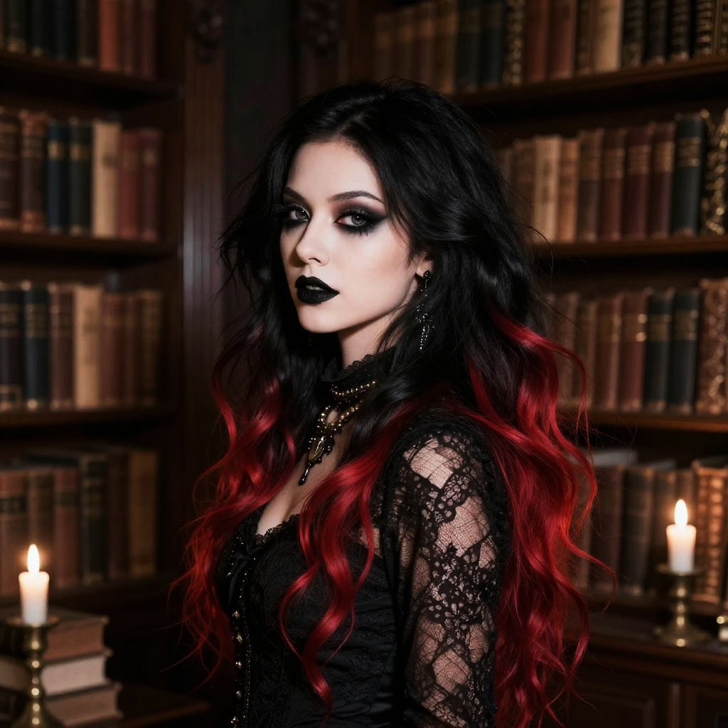 Black and red goth hair flowing freely with flickering red tips, paired with dark lace clothing and smoky eye makeup, positioned in a dimly lit old library filled with ancient books and candlelight, evoking a mystical gothic ambiance.