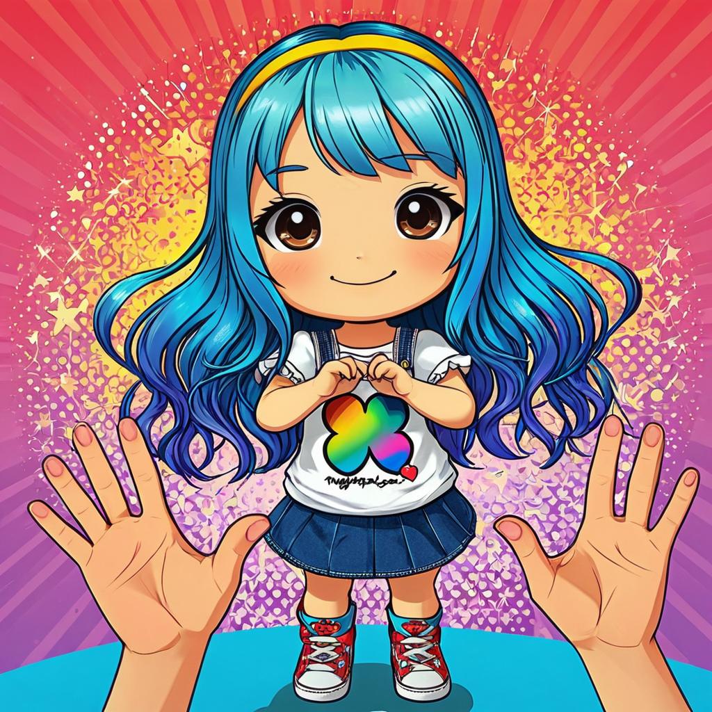Masterpiece, best quality, intricate detail, intricate background detail, 1girl, gradient hair, happy, full body, pop art, chibi art, pov hands, headpatting