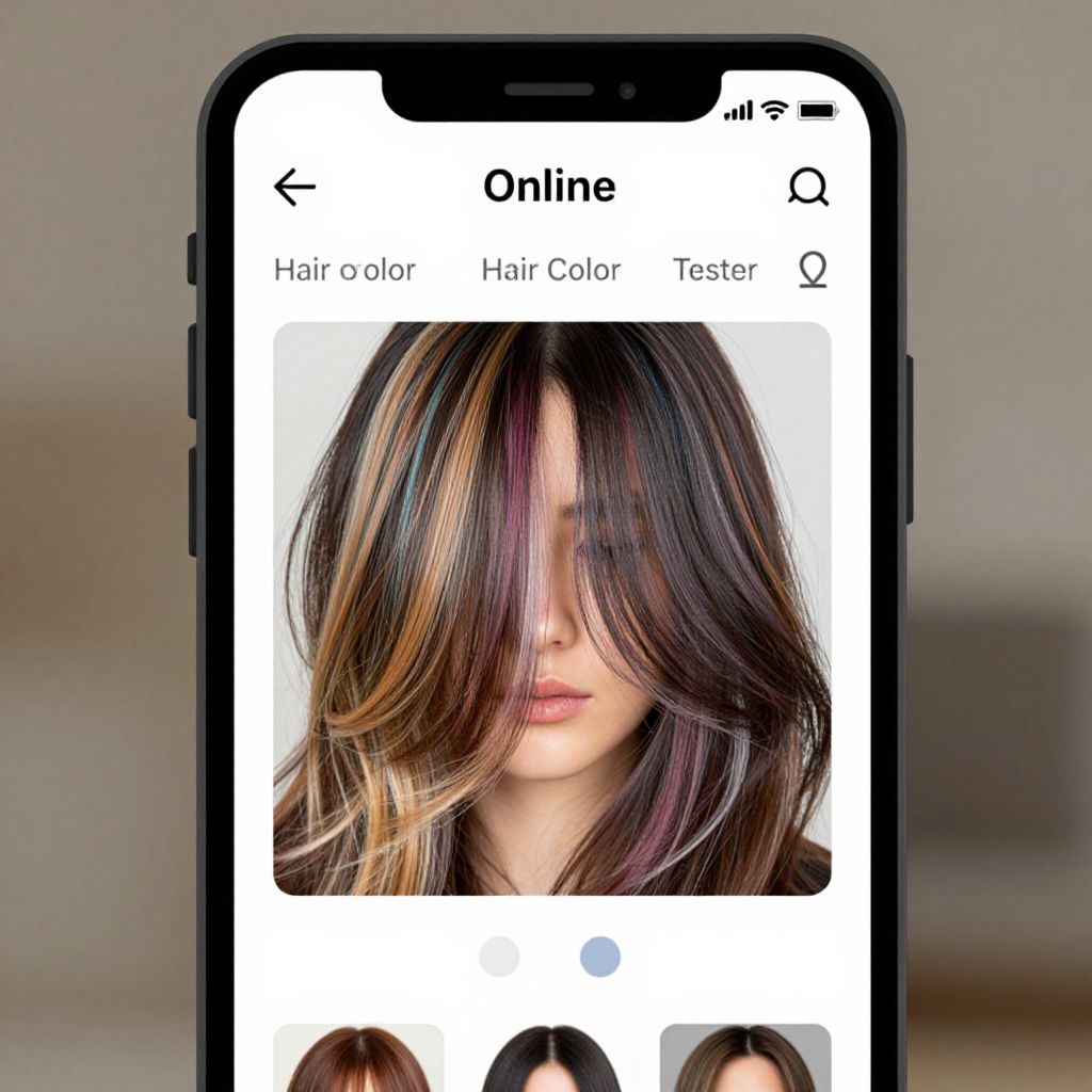 Hair color tester online app concept, close-up of a smartphone screen showing virtual hair color transformation, bright and varied hair color palette, interactive UI elements, detailed hair strands, seamless blending of colors on a model's hair