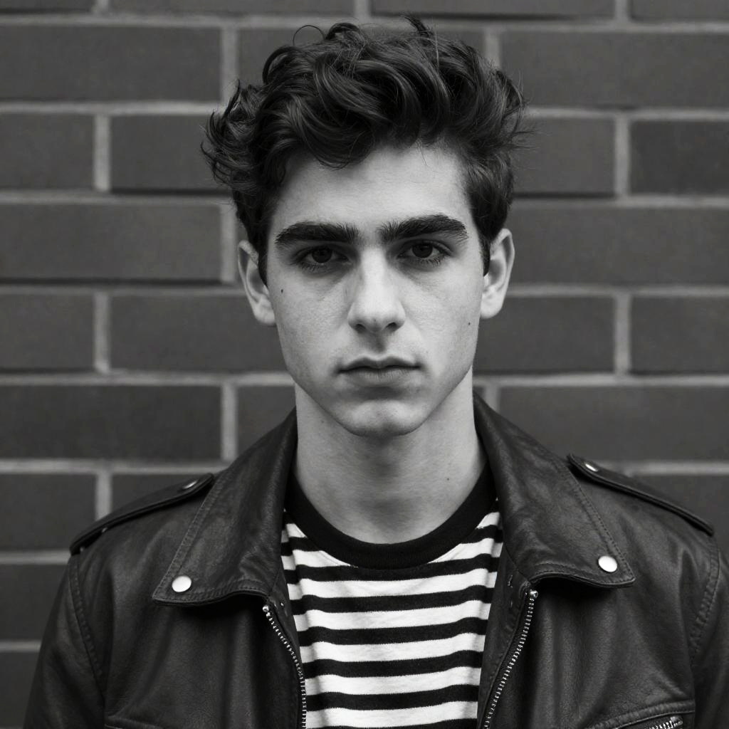 Black-and-white photograph of a young man with dark, wavy hair, intense gaze, wearing a dark leather jacket over a black and white striped shirt. Brick wall in the background. He has a small mole on his right cheek. Upper body portrait.