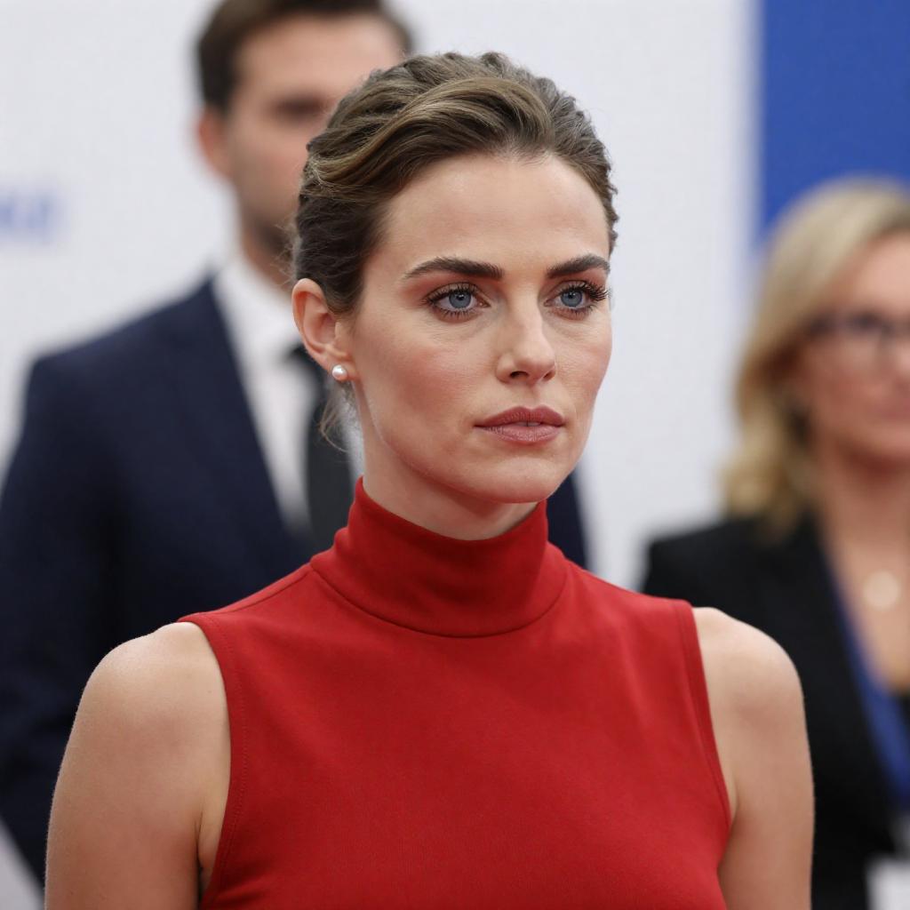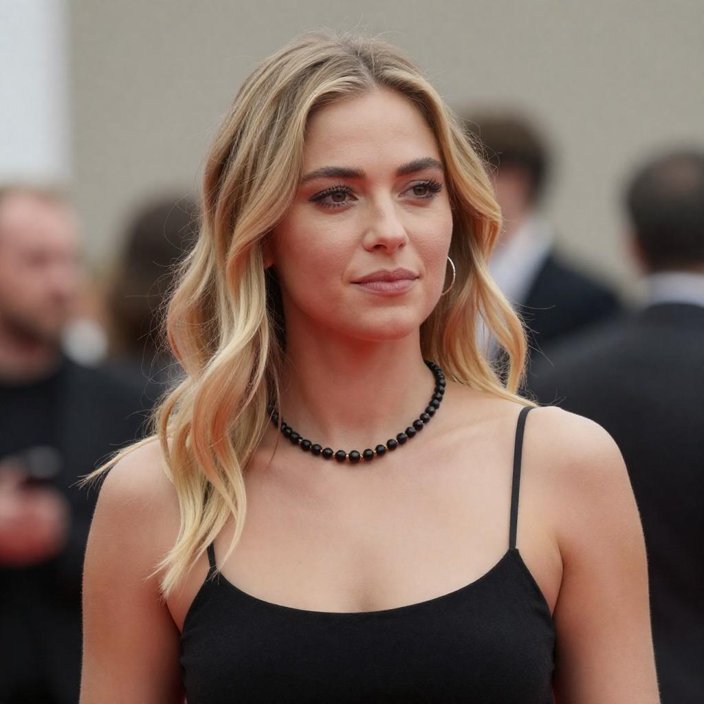Photograph of two women in a dimly lit setting. Front woman has curly blonde hair, blue eyes, wearing black low-cut top and pink earrings, intense expression. Background woman with long blonde hair, sunglasses, black leather jacket, blurred.