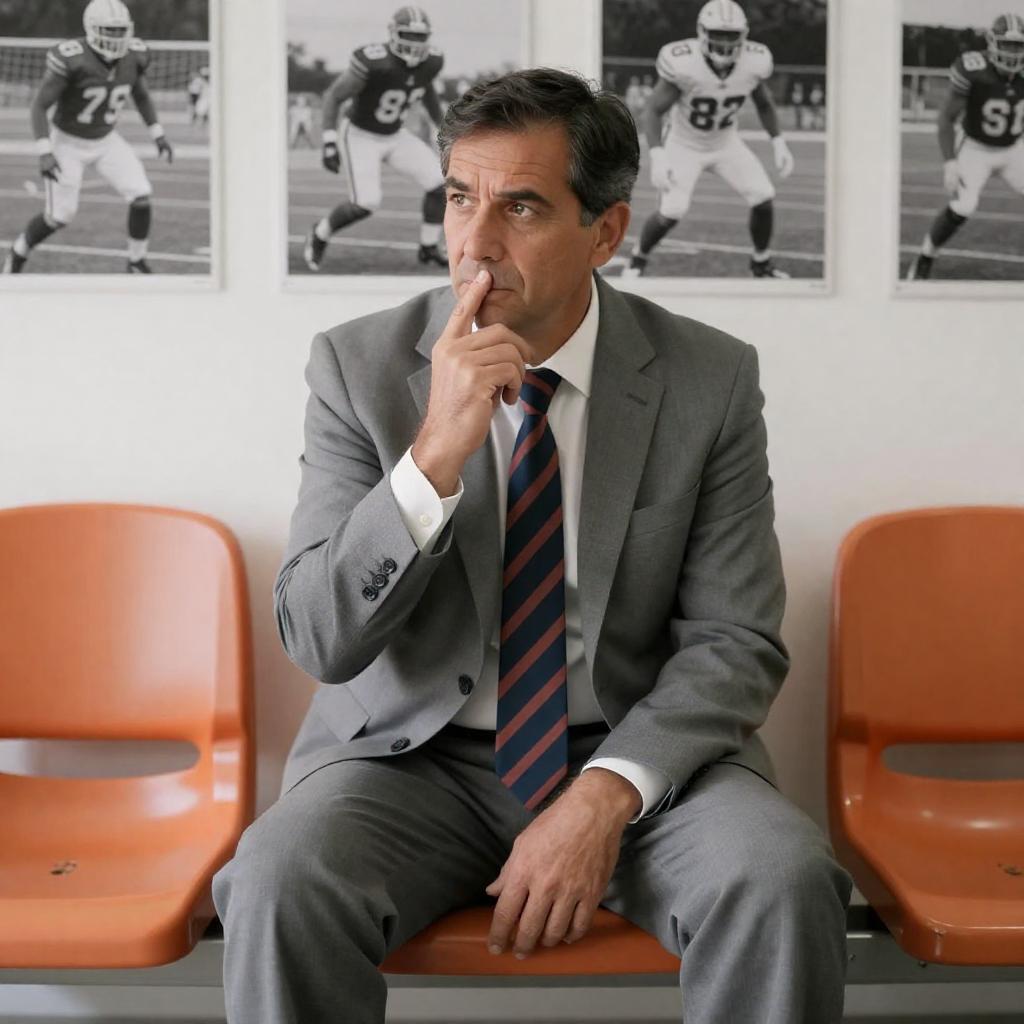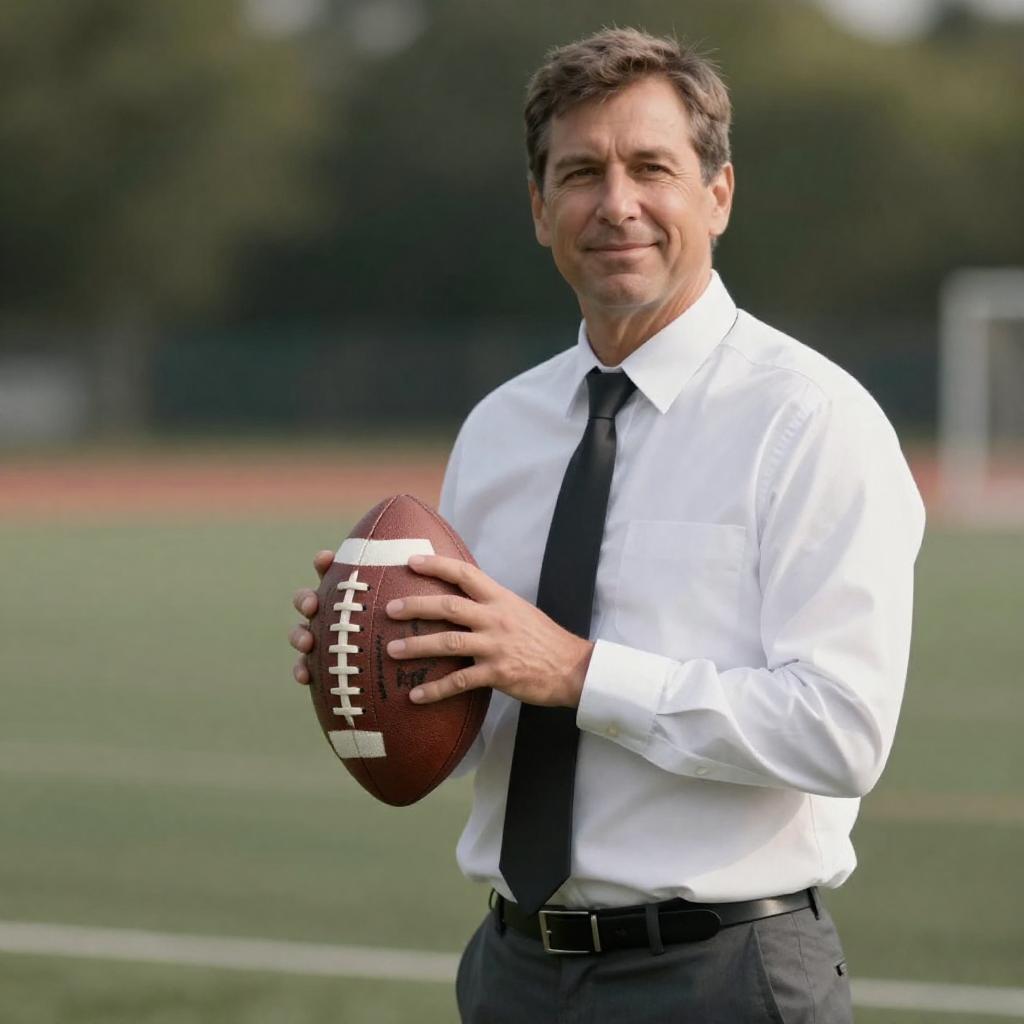 Photograph of a middle-aged man with short brown hair, wearing a white dress shirt, black tie, and gray pants, holding a brown football. He stands on a green field with a blurred background. He smiles slightly. One hand grips the top of the football while the other holds it near the bottom.